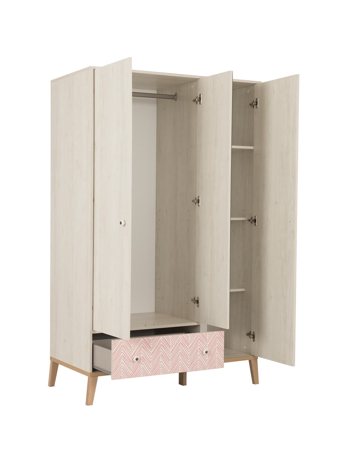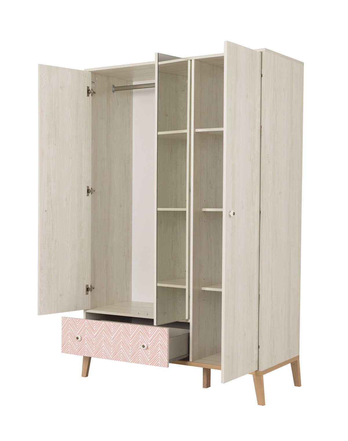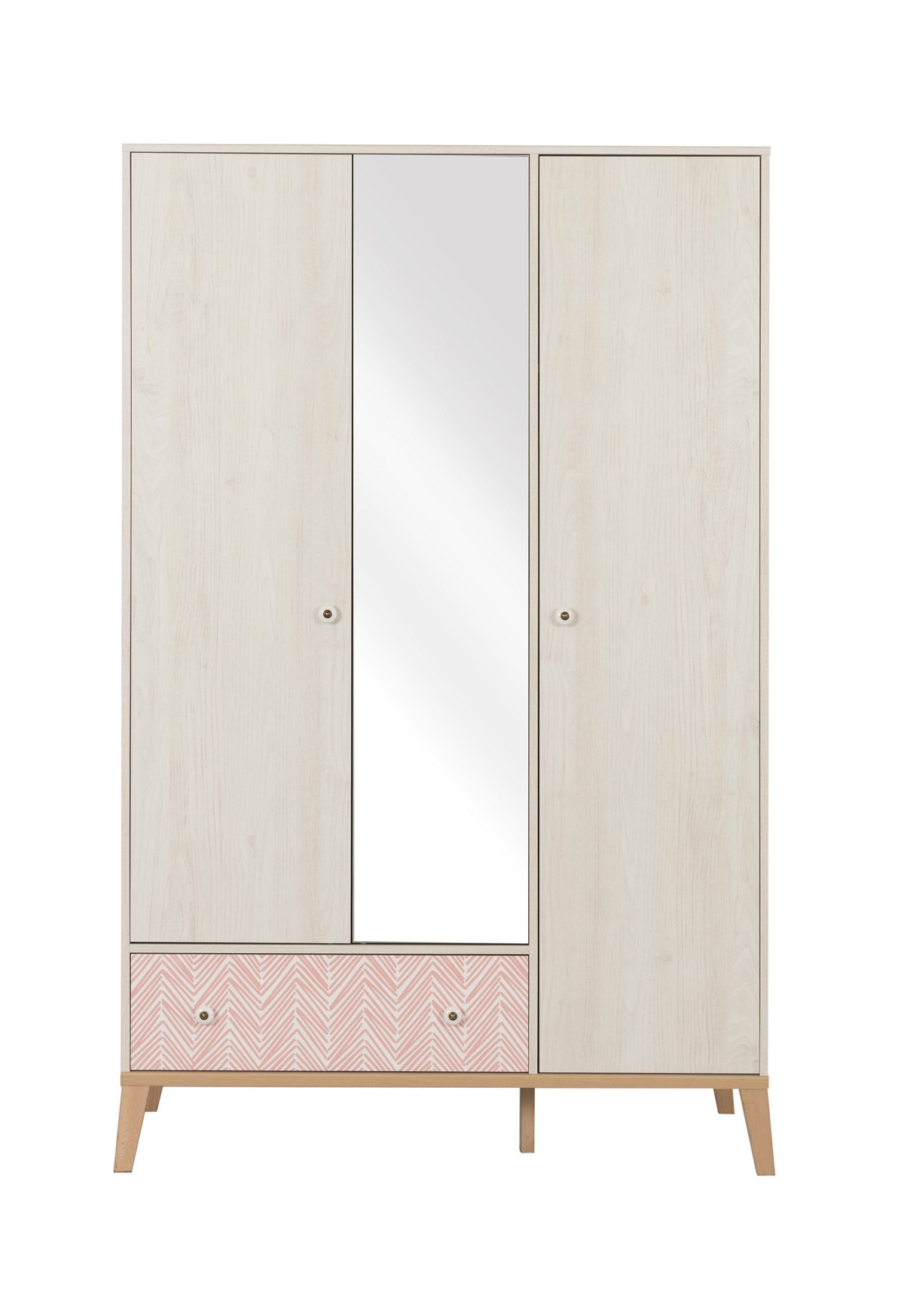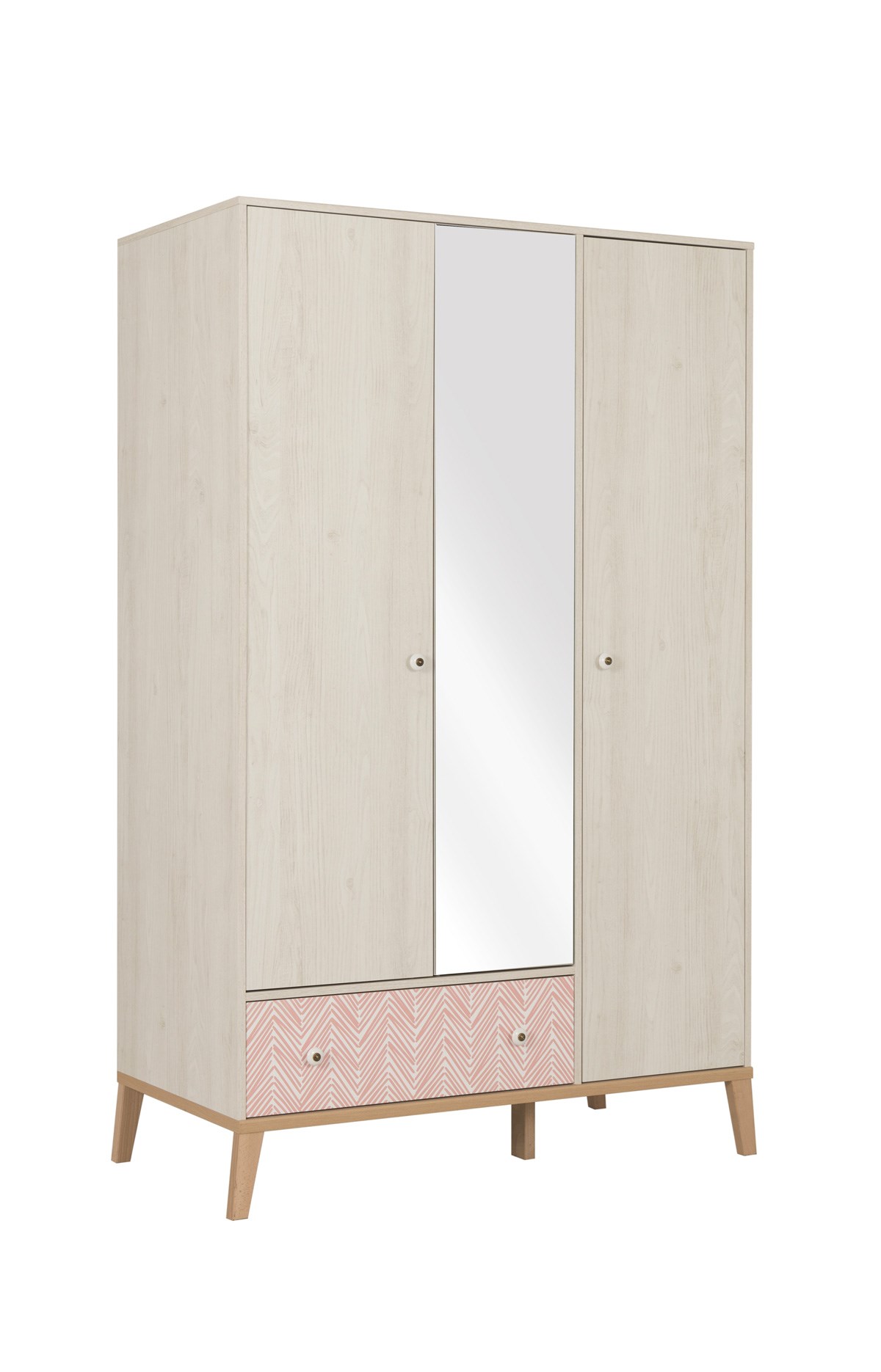 Le décor en bois blanchi avec des touches de couleurs tendres apportent de la douceur à la chambre de votre enfant. L'armoire ALIKA de style nordique avec des imprimés tendance est fonctionnelle grâce à ses 3 portes battantes. Deux tiers de l'armoire sont consacrés à la penderie et un tiers aux étagères. Votre enfant pourra y ranger tous ses vêtements. Le tiroir est fait pour les accessoires ou sous-vêtements. Le miroir intégré est pratique lorsque votre bout de chou voudra s'admirer. Les pieds sont en hêtre et les poignées en porcelaine.