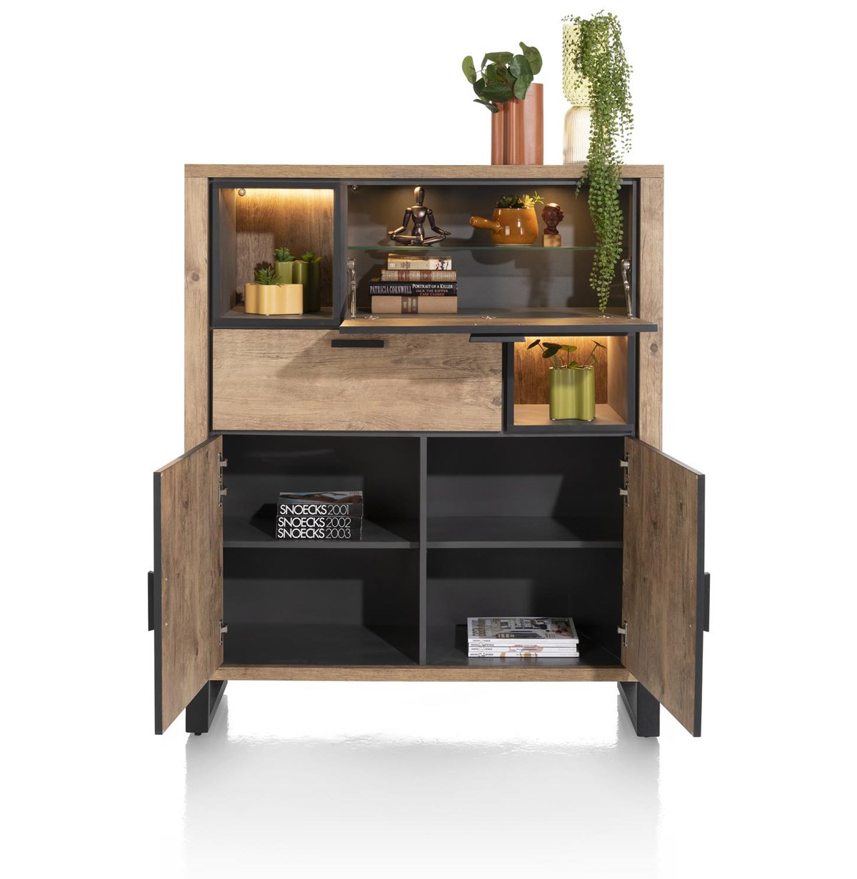 Avec ses dimensions de 125 cm de large et 150 cm de haut, ce meuble offre un grand espace de rangement : un abattant, un tiroir et deux grandes portes permettent de ranger facilement vos affaires. De plus, il comporte deux petits compartiments ouverts avec éclairage LED, parfaits pour mettre en valeur vos objets de décoration.