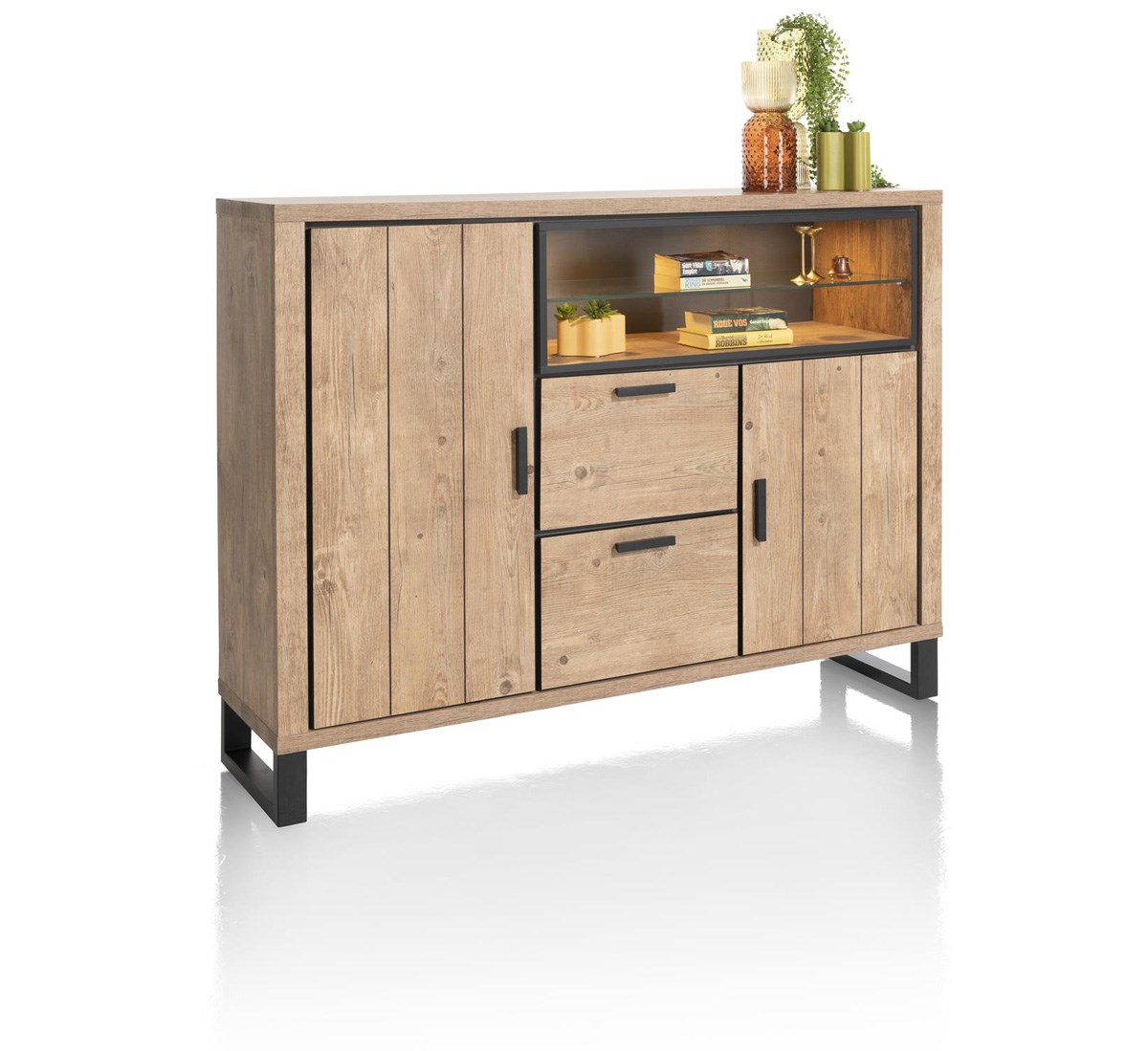Le meuble dispose d’une grande et d’une petite porte, de deux tiroirs et d’un grand compartiment ouvert avec étagère en verre au centre, idéal pour exposer vos plus beaux accessoires ou verrerie. Il offre ainsi de nombreuses possibilités de rangement visible ou discret.