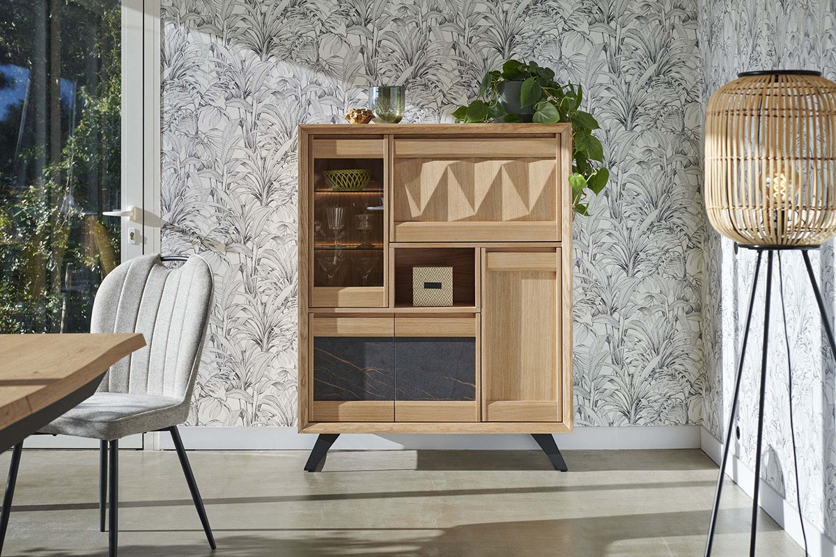 Découvrez le bar DELTA : doté de 4 portes, 1 porte abattante et 1 niche. Fabriqué en chêne massif et placage, avec des incrustations en bois en forme de pointe de diamant. Un design intemporel et contemporain pour sublimer votre intérieur.