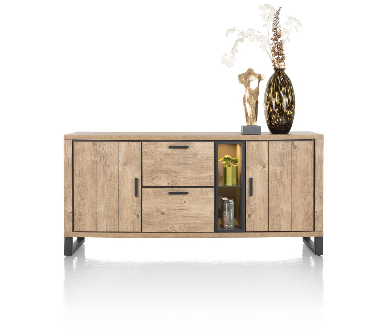 Avec ses dimensions (L 190 x P 42 x H 80), ce buffet offre beaucoup de rangement : 2 portes, 2 grands tiroirs et 2 niches ouvertes avec éclairage LED écoénergétique. Les portes et tiroirs sont équipés d’un système soft-closing pour une fermeture douce.