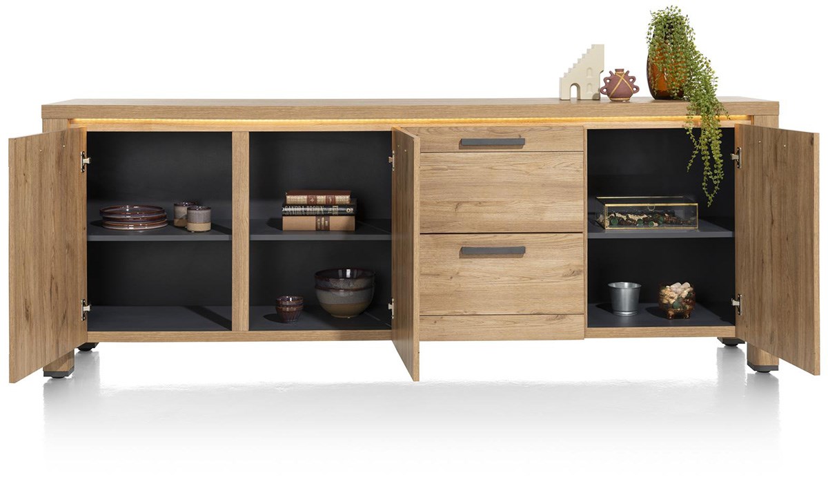 Le buffet DELMONTE allie charme authentique et fonctionnalité moderne. Avec ses 230 cm de large, il offre un vaste espace de rangement grâce à 3 portes et 2 tiroirs à fermeture douce.