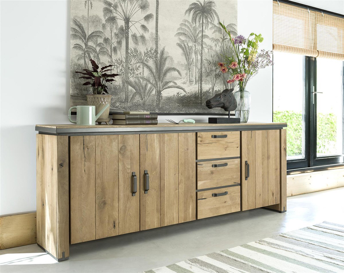Pour une ambiance chaleureuse, optez pour la collection FARMLAND. Le buffet en chêne et placage possède 3 portes et 3 tiroirs. Le mariage du bois et du métal présent dans les détails donnent du caractère au meuble. Avec son style champêtre et industriel, le buffet FARMLAND se remarque dans votre intérieur !