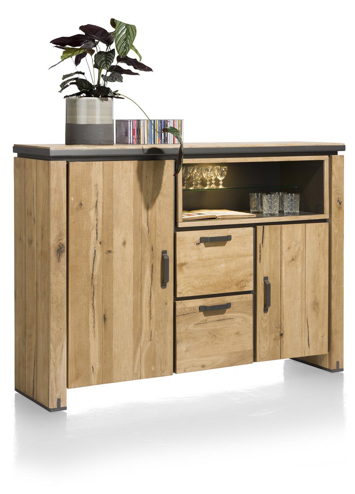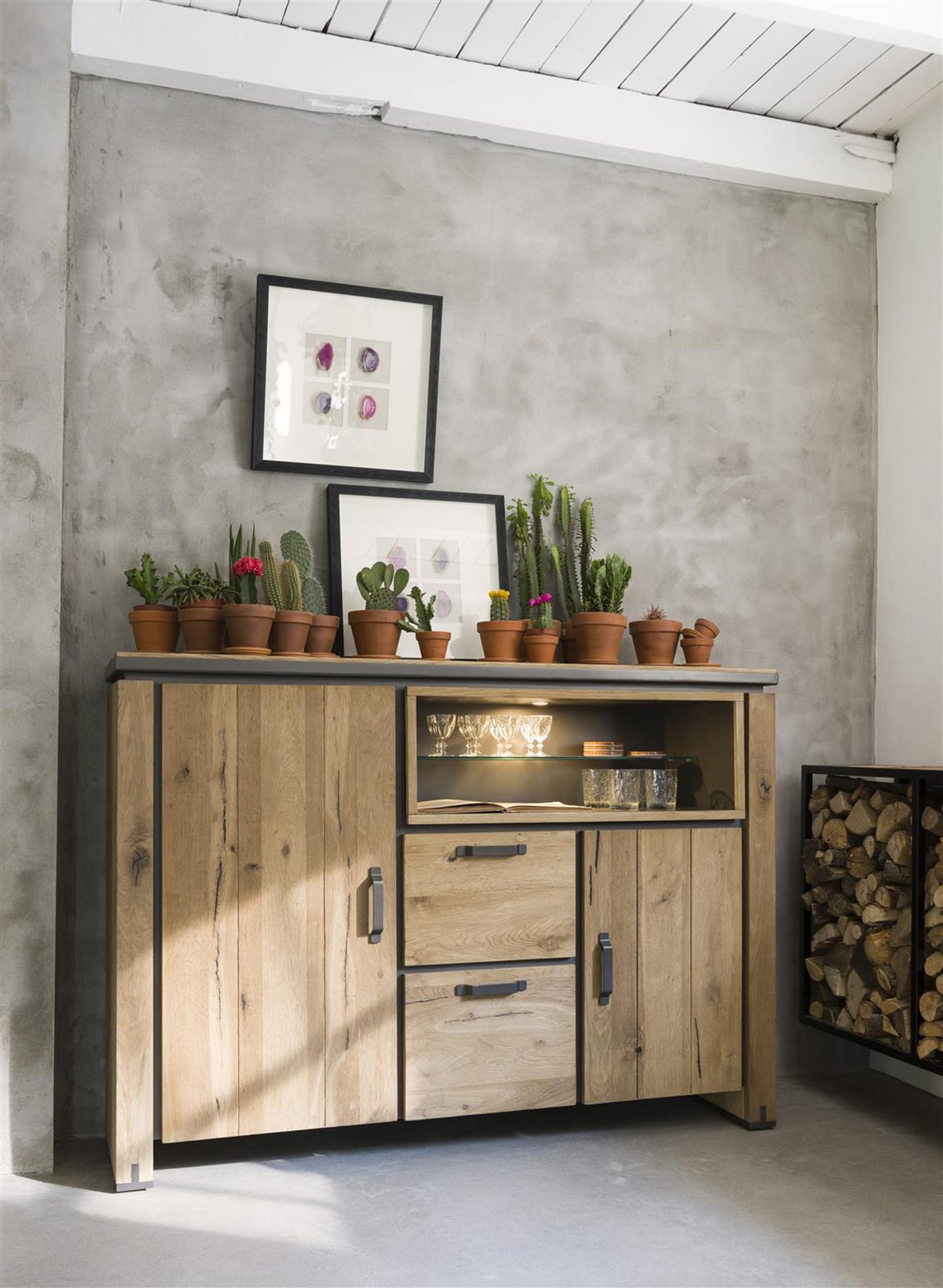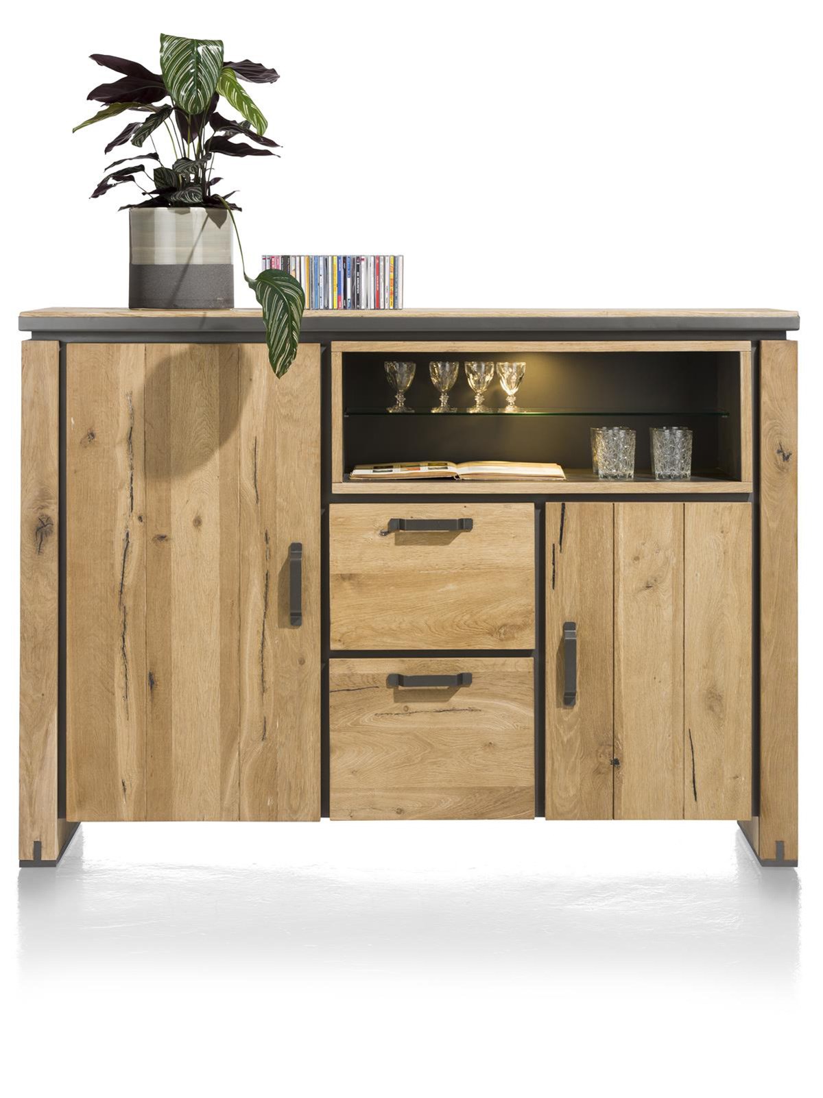 Pour une ambiance chaleureuse, optez pour la collection FARMLAND. Le buffet en chêne et placage possède 2 portes, 2 tiroirs et 2 niches avec éclairage LED intégré. Le mariage du bois et du métal présent dans les détails donnent du caractère au meuble. Avec son style champêtre et industriel, le buffet FARMLAND se remarque dans votre intérieur !