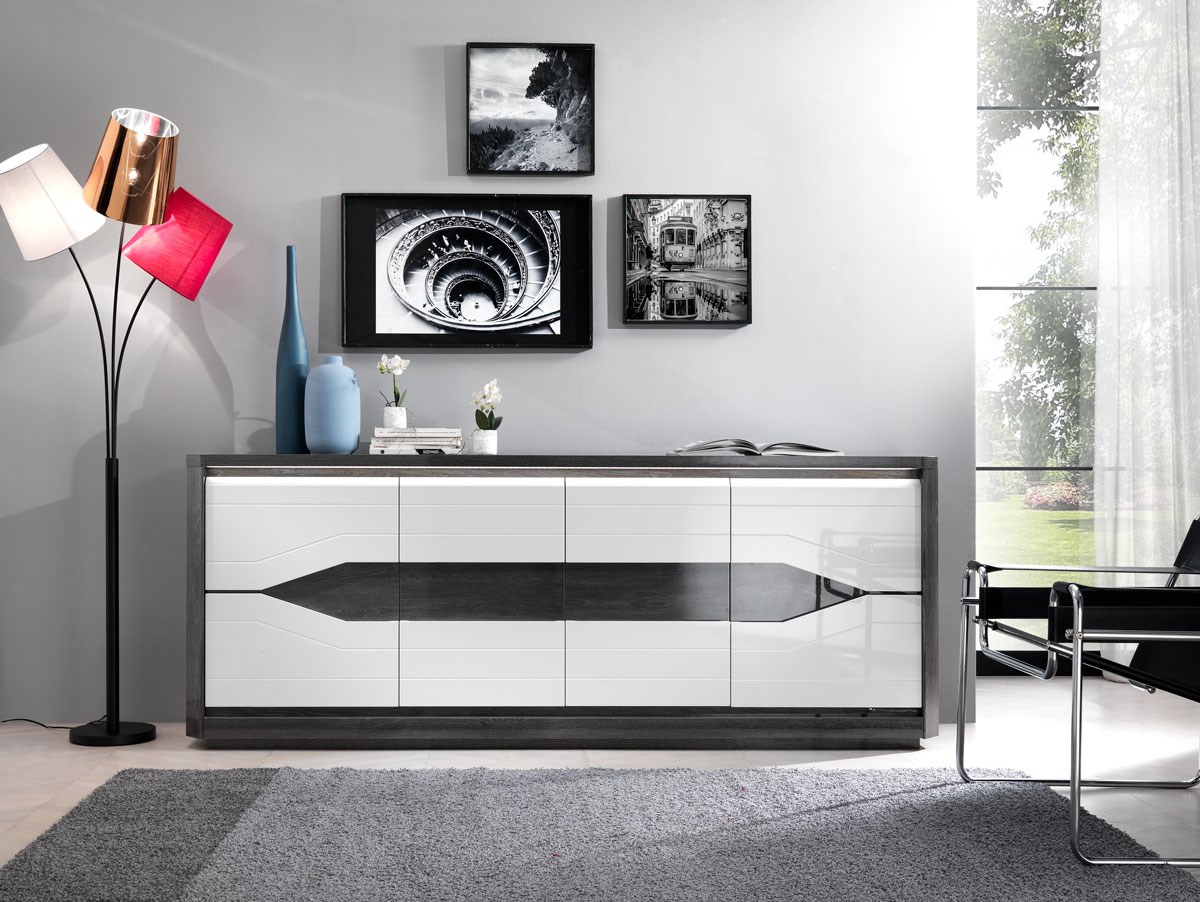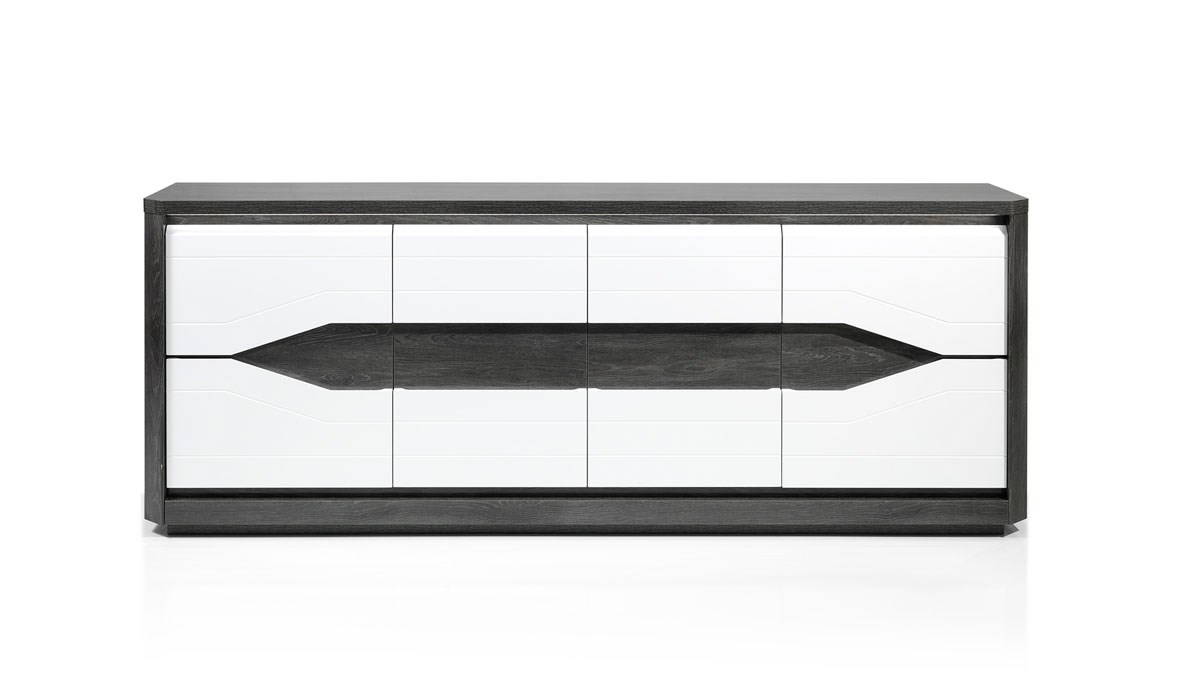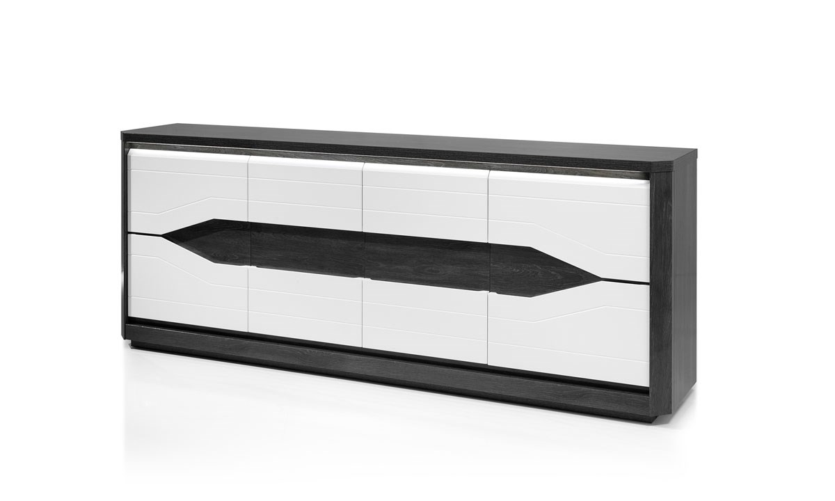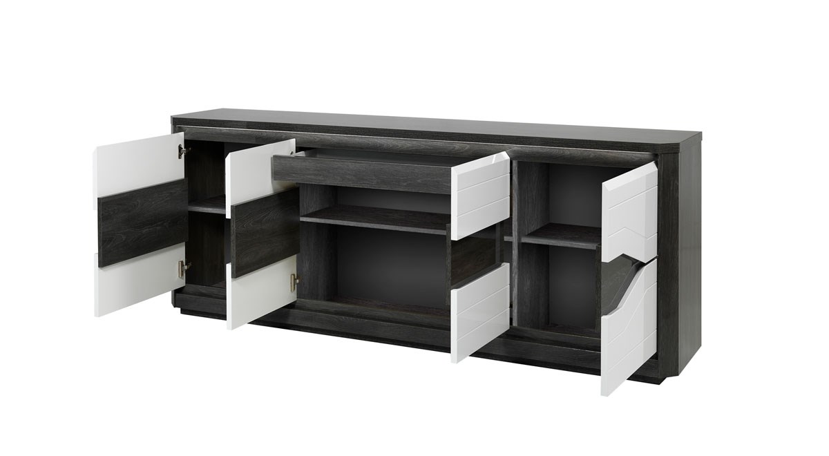 Buffet MATERA 220cm avec un contraste réussi entre le blanc brillant et le gris. Équipé de 4 portes et d'1 tiroir avec système fermeture ralentisseur pour un espace de rangement important. Avec éclairage LED intégré dans le plateau. Également disponible avec 3 portes. Combinez le buffet MATERA avec d'autres meubles de la même série.