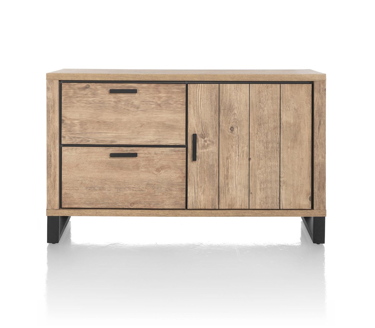 Avec 1 porte et 2 grands tiroirs, ce buffet offre un rangement pratique. Il peut être utilisé seul ou combiné avec une partie haute pour former une buffet complet. Les portes et tiroirs soft-closing, ainsi que les poignées en métal noir et les pieds robustes, lui donnent un style à la fois fonctionnel et élégant.