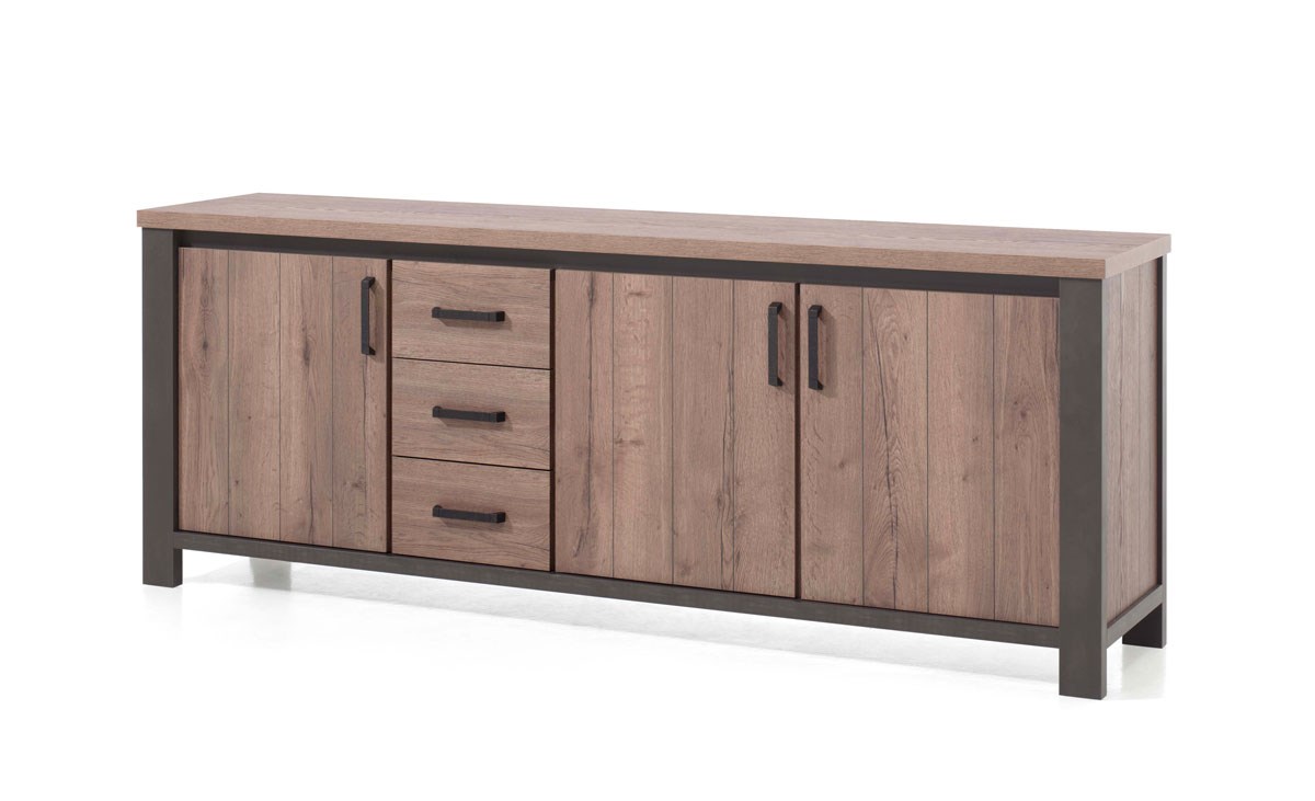 Le buffet SMASH au look industriel est moderne. Son coloris chêne et anthracite se marie à votre intérieur, elle a ce côté authentique et lumineux qui ravira aussi bien vos convives que vous-même.