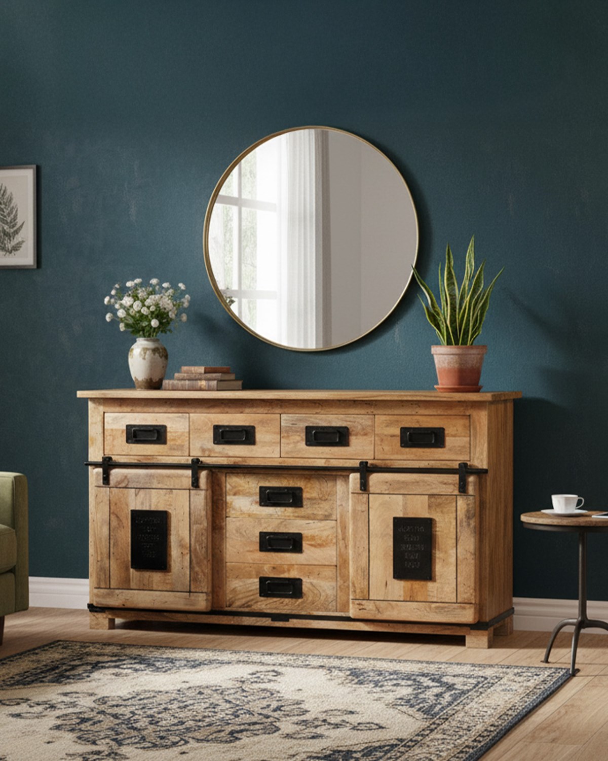 Le buffet Titan de 150 cm est un meuble au design raffiné, réalisé en bois de manguier, qui allie robustesse et esthétique. Avec ses 2 portes et ses 7 tiroirs, il offre un large espace de rangement pour organiser vos objets du quotidien avec élégance. Sa finition naturelle et ses lignes épurées s’intègrent parfaitement dans tous les intérieurs, apportant chaleur et caractère à votre décoration. Un choix idéal pour allier praticité et style.