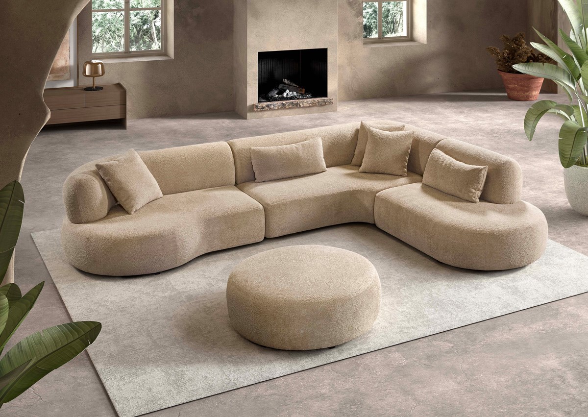 Le canapé d’angle ANICK est disponible en plusieurs couleurs et compositions, vous permettant de choisir facilement la version qui correspond à votre espace et à vos goûts. Sur la photo, un pouf assorti est visible – disponible en option – idéal comme siège supplémentaire ou repose-pieds confortable.