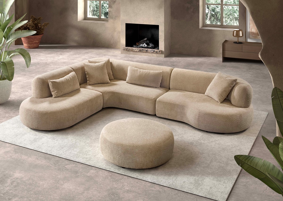 Le canapé d’angle ANICK est disponible en plusieurs couleurs et compositions, vous permettant de choisir facilement la version qui correspond à votre espace et à vos goûts. Sur la photo, un pouf assorti est visible – disponible en option – idéal comme siège supplémentaire ou repose-pieds confortable.