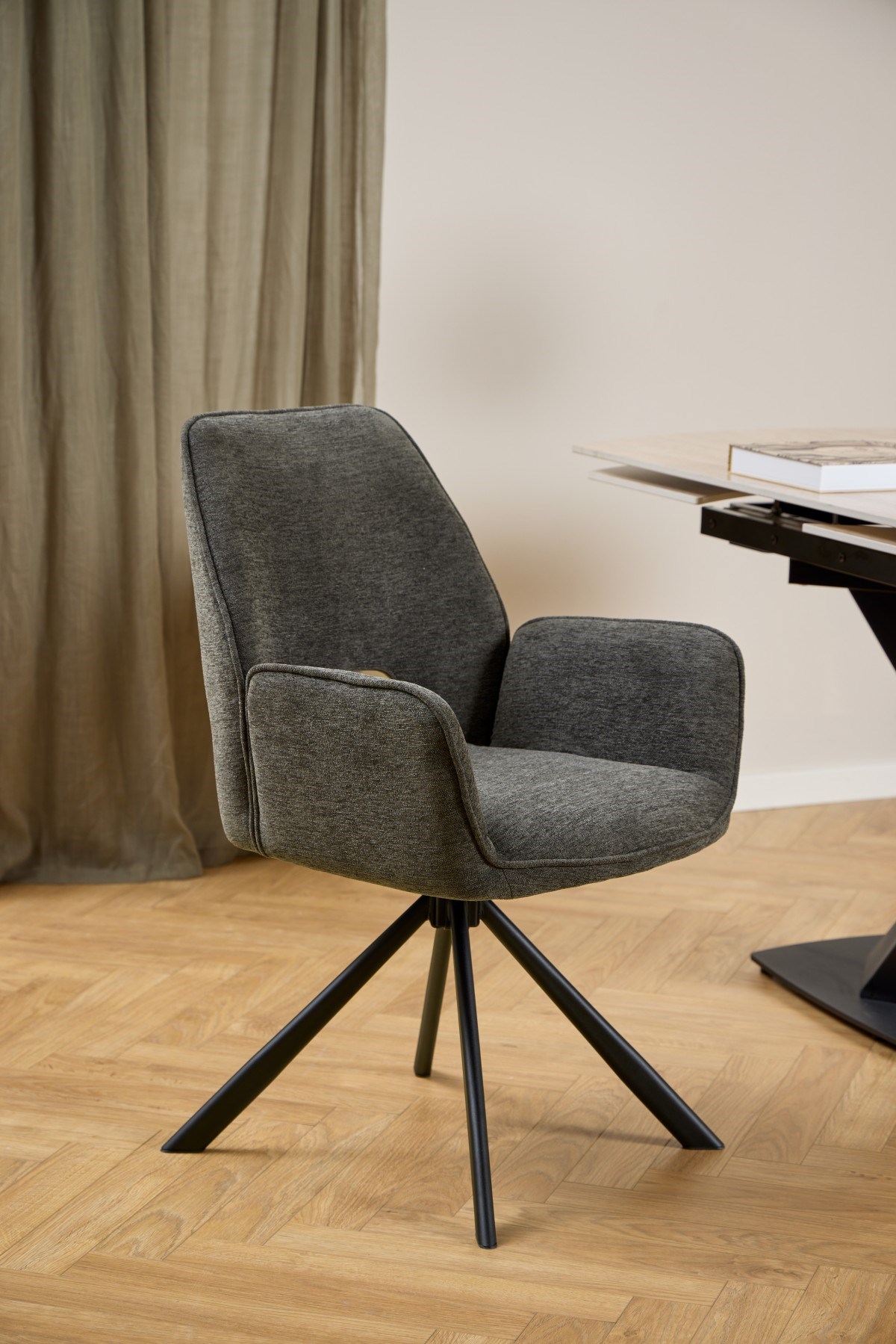Conçue pour un confort optimal, cette chaise est équipée d’une assise pivotante, idéale pour faciliter les mouvements autour de la table. Sa base noire à 4 étoiles, à la fois stable, robuste et contemporaine, complète harmonieusement le design.
