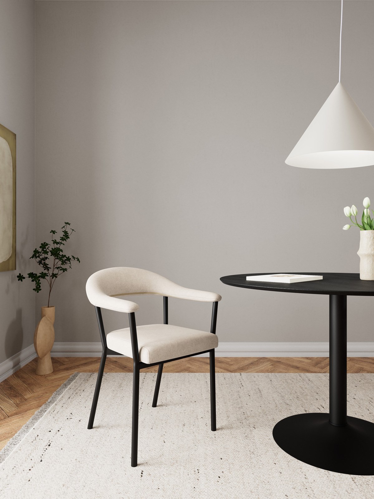 Revêtue d’un tissu chenille Apia sable 140, doux au toucher, cette chaise enveloppe délicatement le corps grâce à son assise incurvée et son dossier ergonomique, garantissant un confort optimal au quotidien.