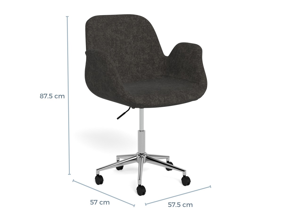 La chaise de bureau BETH avec accoudoirs allie design moderne et confort optimal. Son assise élégante, aux courbes douces, est habillée d’un tissu chenille Apia gris foncé 458 FR, offrant un toucher agréable et une finition soignée. Dotée d’une mousse moulée, elle garantit un soutien durable pour un usage quotidien.