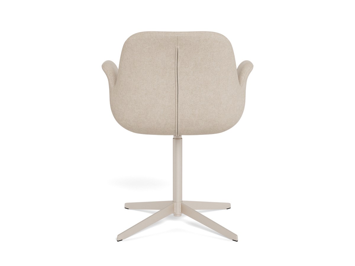 La chaise repose sur un pied central en métal gris soutenu par quatre branches solides. Ce piètement garantit à la fois stabilité et look contemporain. Grâce à la fonction pivotante, la BETH est extrêmement pratique, que ce soit autour d’une table de salle à manger ou comme chaise de bureau dans un home office.