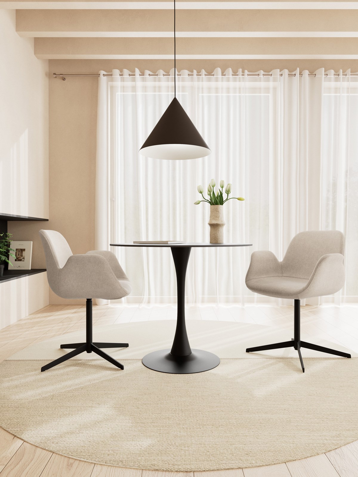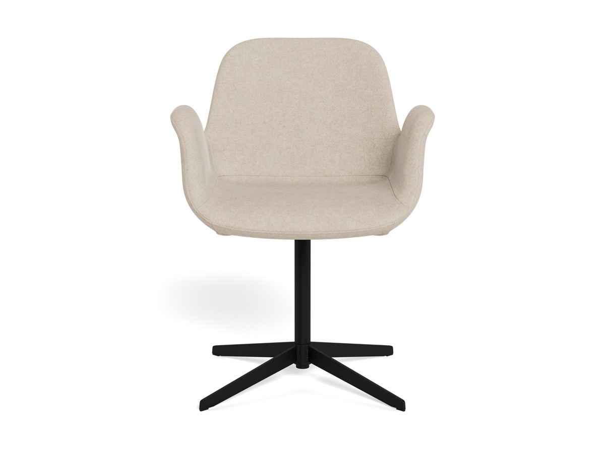 La chaise repose sur un pied central en métal noir soutenu par quatre branches solides. Ce piètement garantit à la fois stabilité et look contemporain. Grâce à la fonction pivotante, la BETH est extrêmement pratique, que ce soit autour d’une table de salle à manger ou comme chaise de bureau dans un home office.