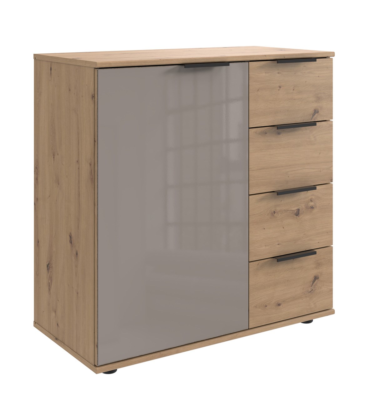 Dotée de 1 porte spacieuse et de 4 tiroirs pratiques en décor bois, elle offre un grand espace de rangement pour organiser vêtements, linge ou accessoires du quotidien.
