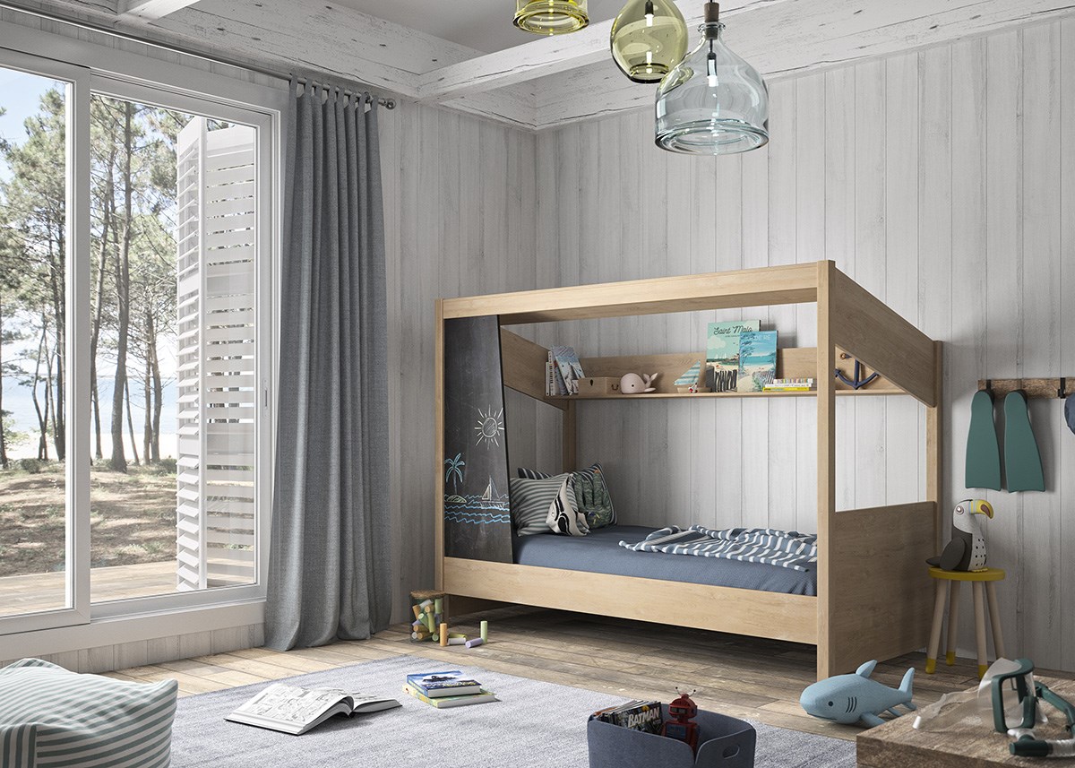 Le lit cabane LUCE est idéal pour libérer la créativité de votre enfant. Une grande étagère en partie haute est idéale pour ranger ses livres, jouets ou autres objets. Le panneau d'occultation est en mélamine anthracite ce qui permettra à votre enfant de s’exprimer par l’écriture ou le dessin à l’aide de craies.