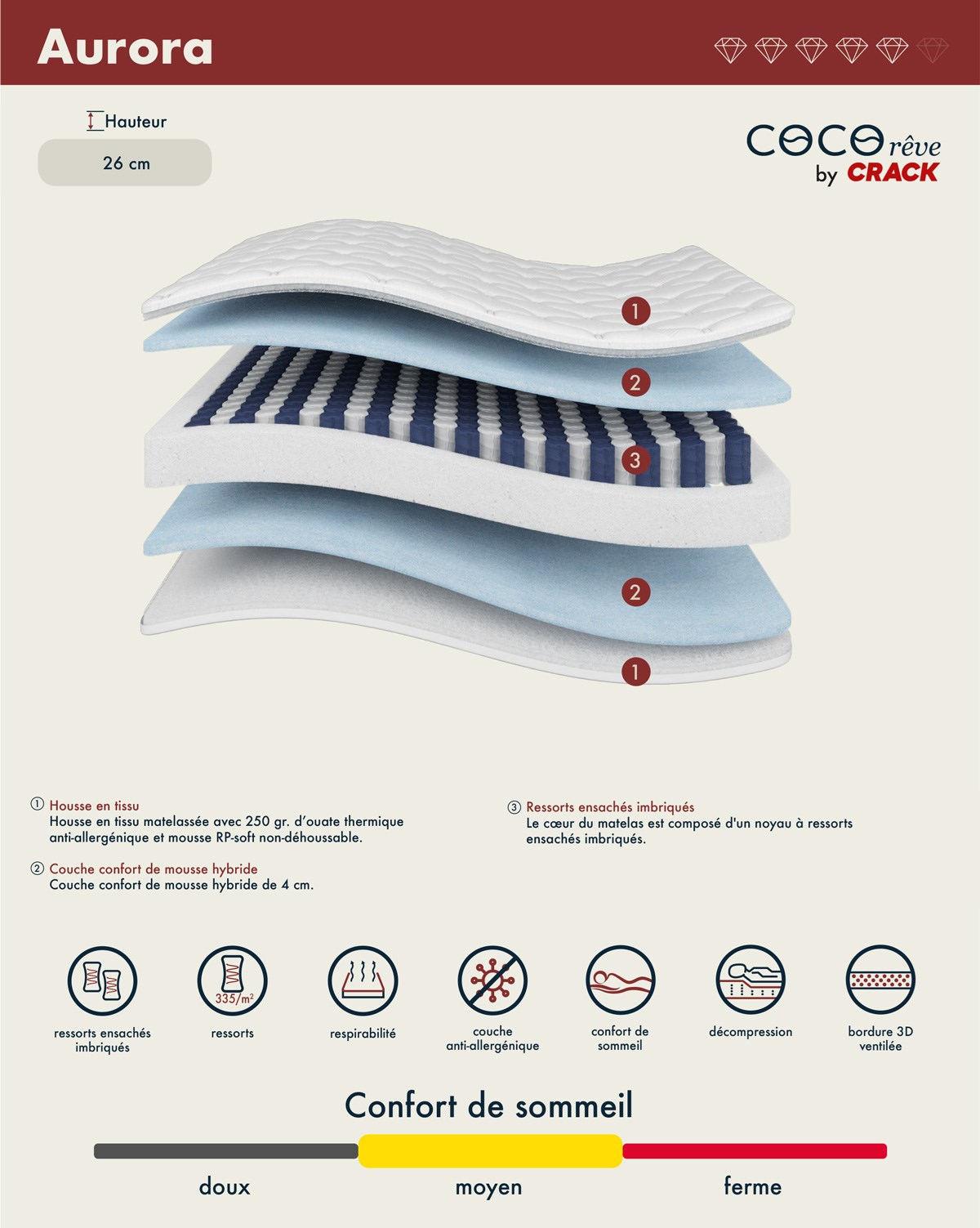 Profitez d’un sommeil équilibré avec le matelas AURORA, d’une hauteur de 26 cm et d’un confort moyen adapté à toutes les morphologies. Il associe une housse en tissu respirant, une couche de mousse hybride pour un soutien harmonieux et des ressorts ensachés imbriqués garantissant une excellente indépendance de couchage. Cette combinaison assure un confort stable et uniforme tout au long de la nuit, pour des réveils reposés et revitalisés.