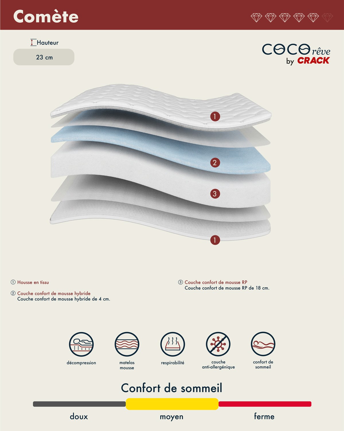 Succombez au bien-être équilibré du matelas COMÈTE, pensé pour offrir un soutien confortable et un accueil de fermeté moyenne. Avec sa hauteur de 23 cm, il combine une housse en tissu respirant, une couche de mousse hybride assurant un bon maintien et une mousse RP qui améliore le confort et la stabilité du couchage. Cette combinaison harmonieuse garantit un soutien uniforme du corps et une sensation agréable tout au long de la nuit.