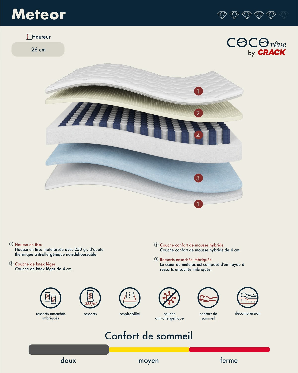 Découvrez un confort de sommeil exceptionnel avec le matelas METEOR, doté d’une hauteur de 26 cm et d’un accueil doux. Il combine une housse en tissu respirant, une couche de latex léger offrant élasticité et fraîcheur, une mousse hybride pour un soutien équilibré, ainsi que des ressorts ensachés imbriqués assurant une excellente indépendance de couchage. Sa structure harmonieuse procure une sensation d’enveloppement agréable, idéale pour des nuits paisibles et réparatrices.