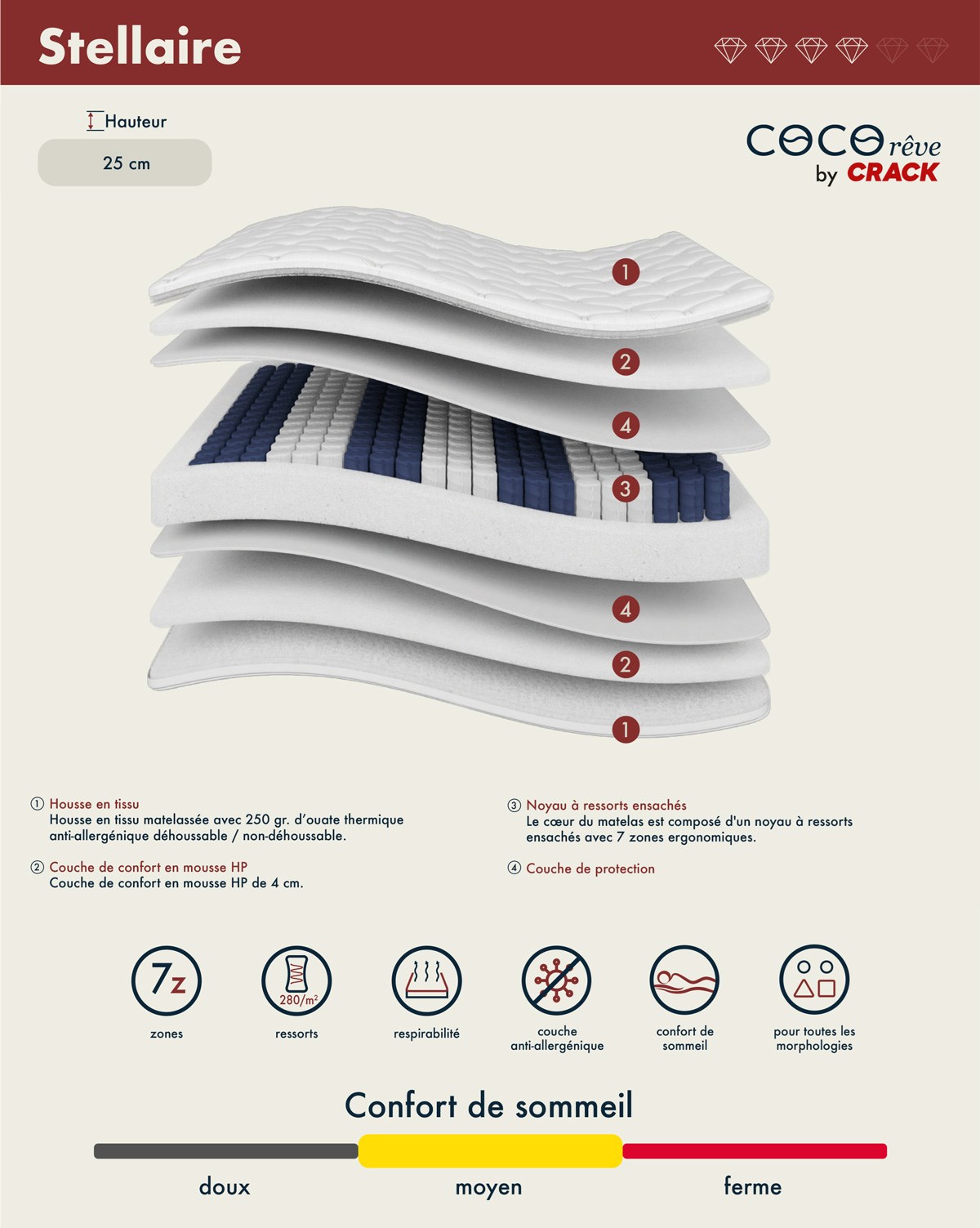 Offrez-vous un sommeil équilibré avec le matelas STELLAIRE, d’une hauteur de 25 cm et d’un confort moyen idéal pour un soutien harmonieux. Sa conception comprend une housse en tissu respirant, une couche de confort en mousse HP pour un maintien optimal, un noyau à ressorts ensachés garantissant une excellente indépendance de couchage, et une couche de protection qui prolonge la durabilité du matelas. Ce mariage de matériaux assure une sensation de confort stable et uniforme pour des nuits réparatrices.