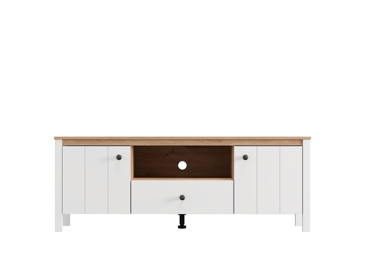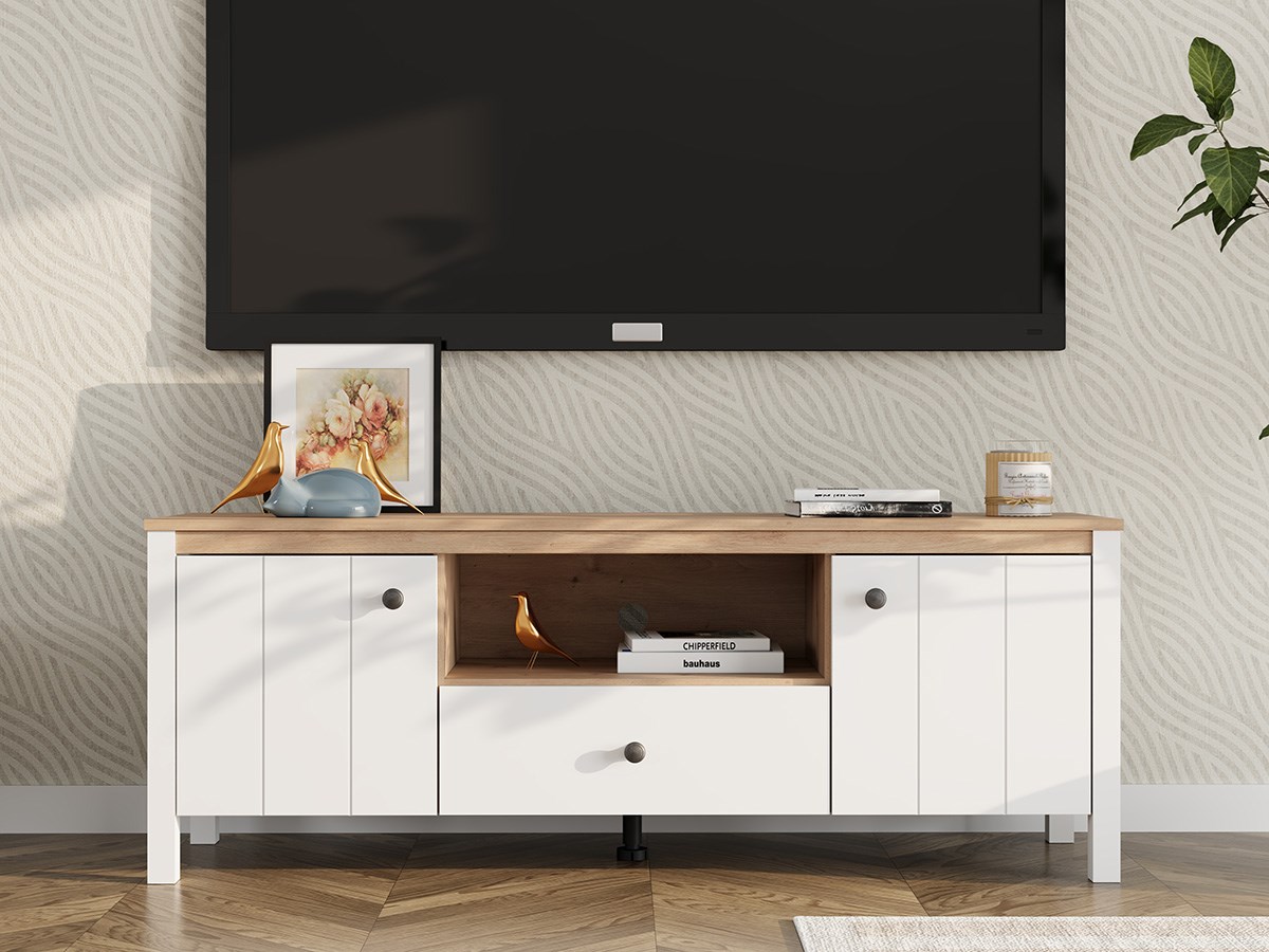Le meuble TV BEDFORD allie design contemporain et fonctionnalité. Conçu en MDF de haute qualité, il associe une finition blanc mat lumineuse à des détails en chêne artisan chaleureux, pour un rendu moderne et intemporel. Doté de 2 portes, 1 tiroir et 1 niche, il offre un espace de rangement pratique pour vos appareils multimédias, accessoires et objets du quotidien. Ses lignes épurées et ses poignées discrètes s’intègrent facilement dans un salon ou un séjour. Solide et élégant, le meuble TV BEDFORD est la solution idéale pour un intérieur organisé et stylé.
