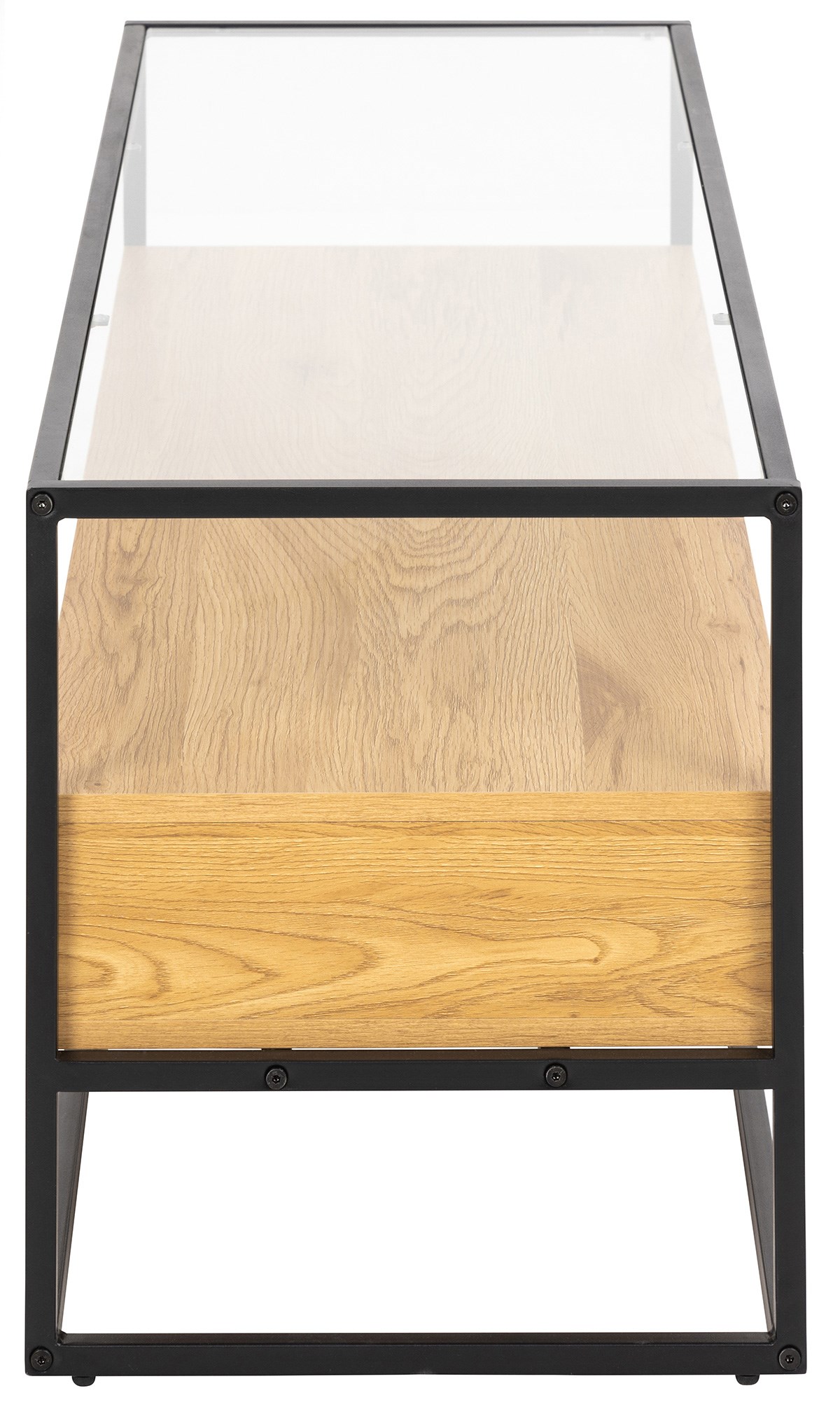 Découvrez le meuble TV Randolf : plateau en verre trempé, structure en acier noir poudré, étagère en mélamine chêne sauvage. Avec son design cubique, elle apporte une touche moderne à votre intérieur.