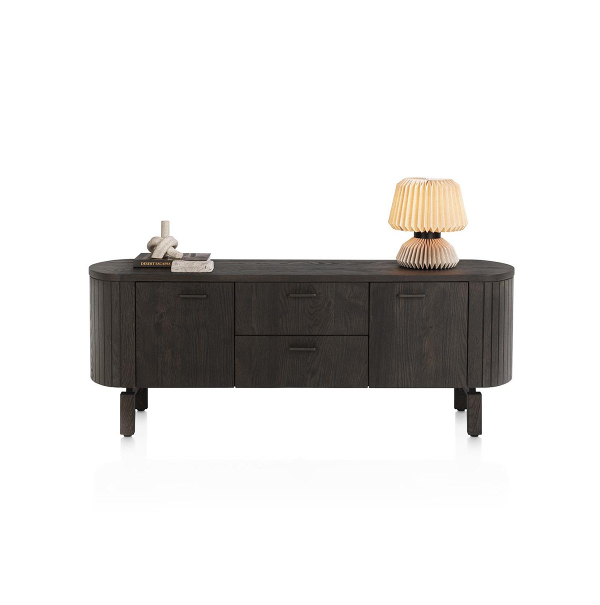 Le meuble est fabriqué en placage chêne de haute qualité et présenté dans une couleur basalte, apportant une touche chaleureuse et naturelle qui s’intègre dans presque tous les intérieurs. Grâce aux portes et tiroirs à fermeture douce (soft closing), tout se ferme silencieusement et en toute sécurité, idéal pour garder votre espace de vie organisé.