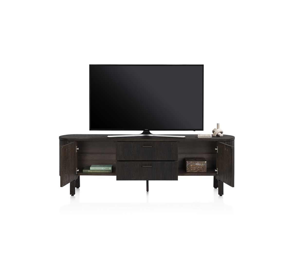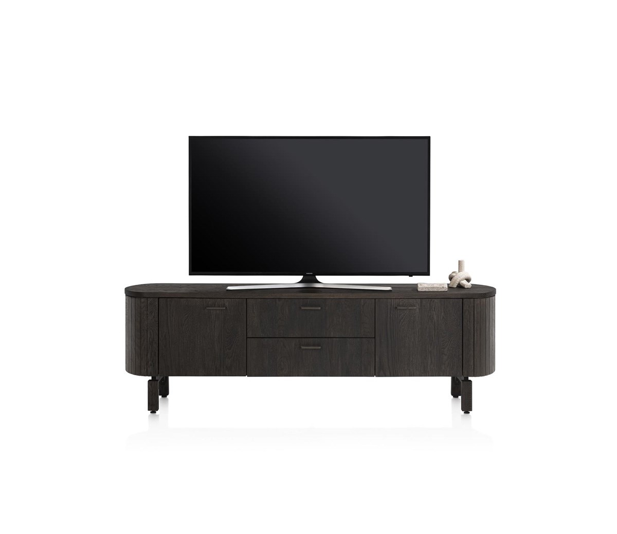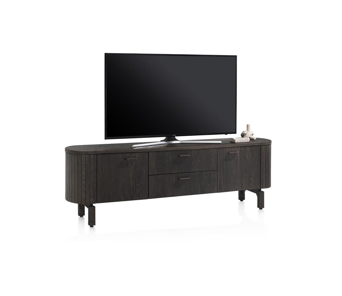 Le meuble est fabriqué en placage chêne de haute qualité et présenté dans une couleur basalte, apportant une touche chaleureuse et naturelle qui s’intègre dans presque tous les intérieurs. Grâce aux portes et tiroirs à fermeture douce (soft closing), tout se ferme silencieusement et en toute sécurité, idéal pour garder votre espace de vie organisé.
