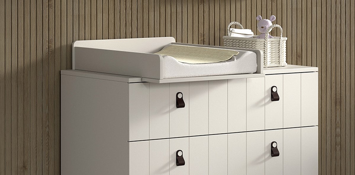 Le plan à langer se fixe facilement sur le dessus de la commode et peut être retiré rapidement lorsque votre bébé groter wordt. De commode blijft volledig bruikbaar zonder zichtbare bevestigingen, ideaal voor latere kinder- en jeugdkamers.