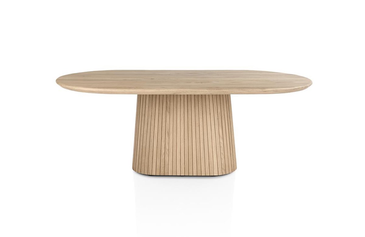 La table est fabriquée en placage chêne durable et est disponible dans la couleur intemporelle dune, mais également en basalt chaleureuse, afin de s’adapter parfaitement à votre style d’intérieur. Son design ovale et épuré apporte une touche moderne à votre salle à manger et en fait un élément élégant et central de votre intérieur.