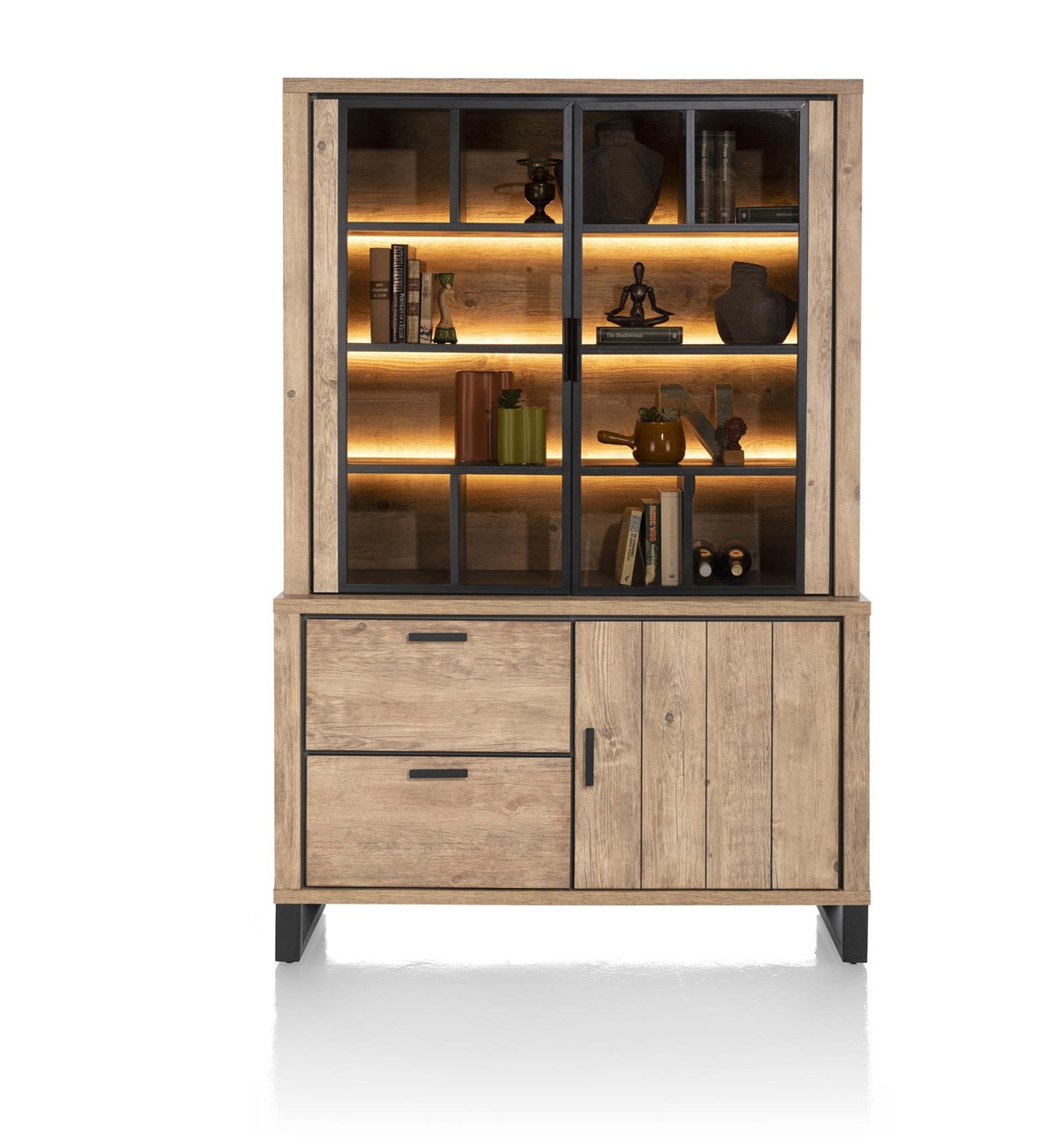 La vitrine PAVAROTTI de la collection Henders & Hazel est le plus grand meuble de cette ligne et allie fonctionnalité et élégance. Ce buffet spacieux se compose d’un bas avec tiroirs et portes, surmonté d’une partie supérieure avec de portes vitrées. Grâce à l’éclairage LED intégré, vos plus beaux objets de décoration sont mis en valeur de manière raffinée.
