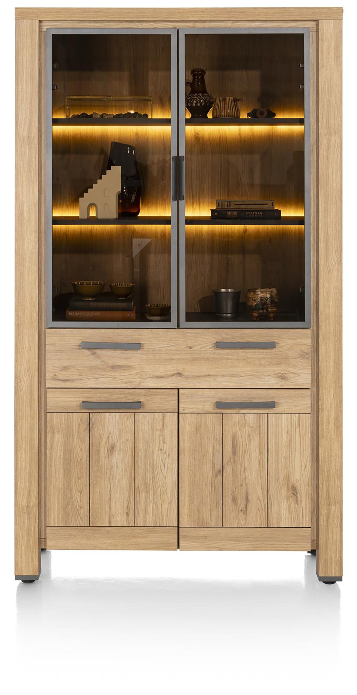 Cette vitrine de 195 cm de haut et 110 cm de large se compose de deux portes pleines en bas, de deux portes vitrées à cadre métallique en haut, et d’un large tiroir central. Elle offre un bel équilibre entre rangement fermé et mise en valeur d’objets décoratifs.