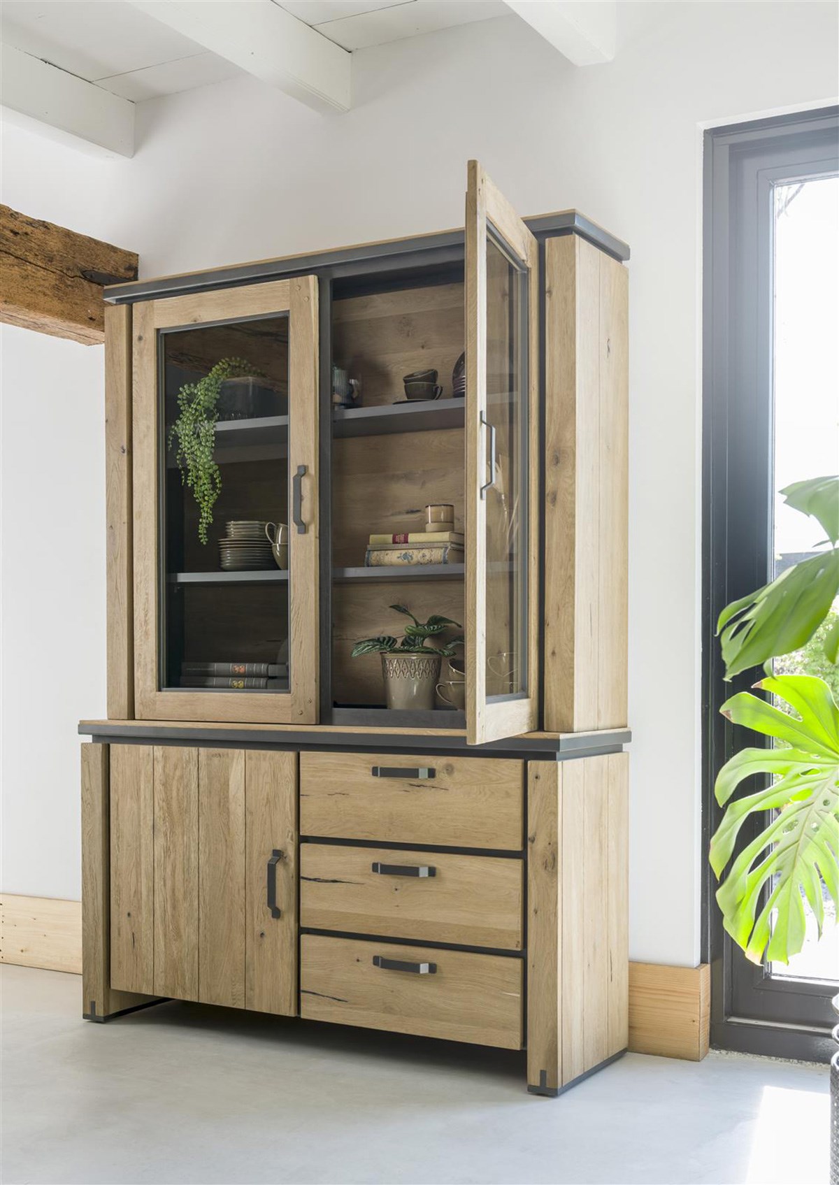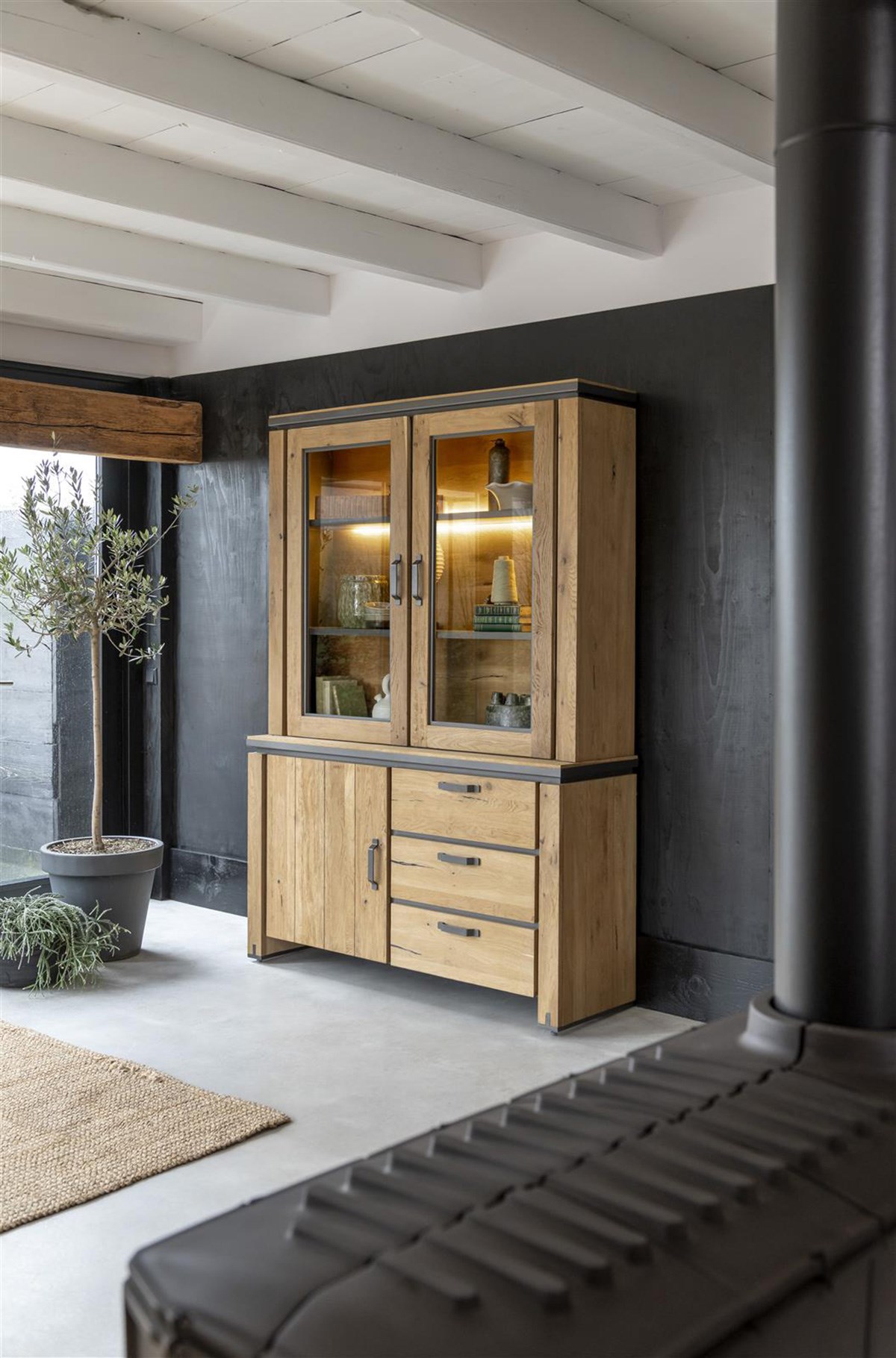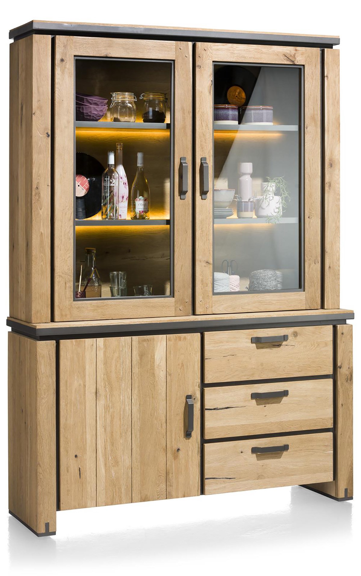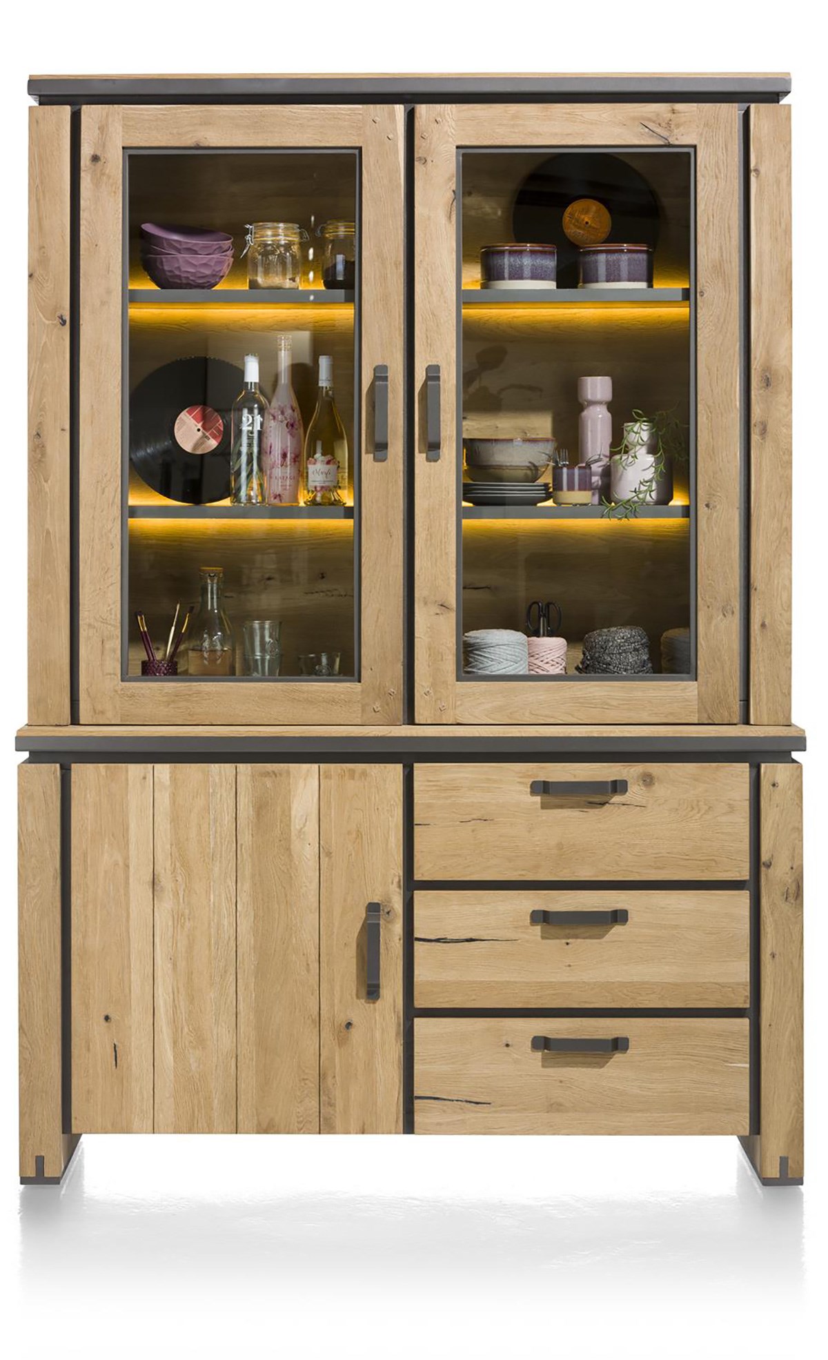 Avec la collection FARMLAND, Henders & Hazel réinvente la vitrine traditionnelle en y apportant une touche de modernité. Conçu en chêne massif et plaqué, ce meuble séduit par son caractère affirmé, souligné par de subtils détails métalliques. Il se compose de deux vitrines éclairées par des LED intégrées, d’un compartiment fermé par une porte et de trois tiroirs spacieux. Un meuble aussi élégant que fonctionnel, parfait pour sublimer votre intérieur.