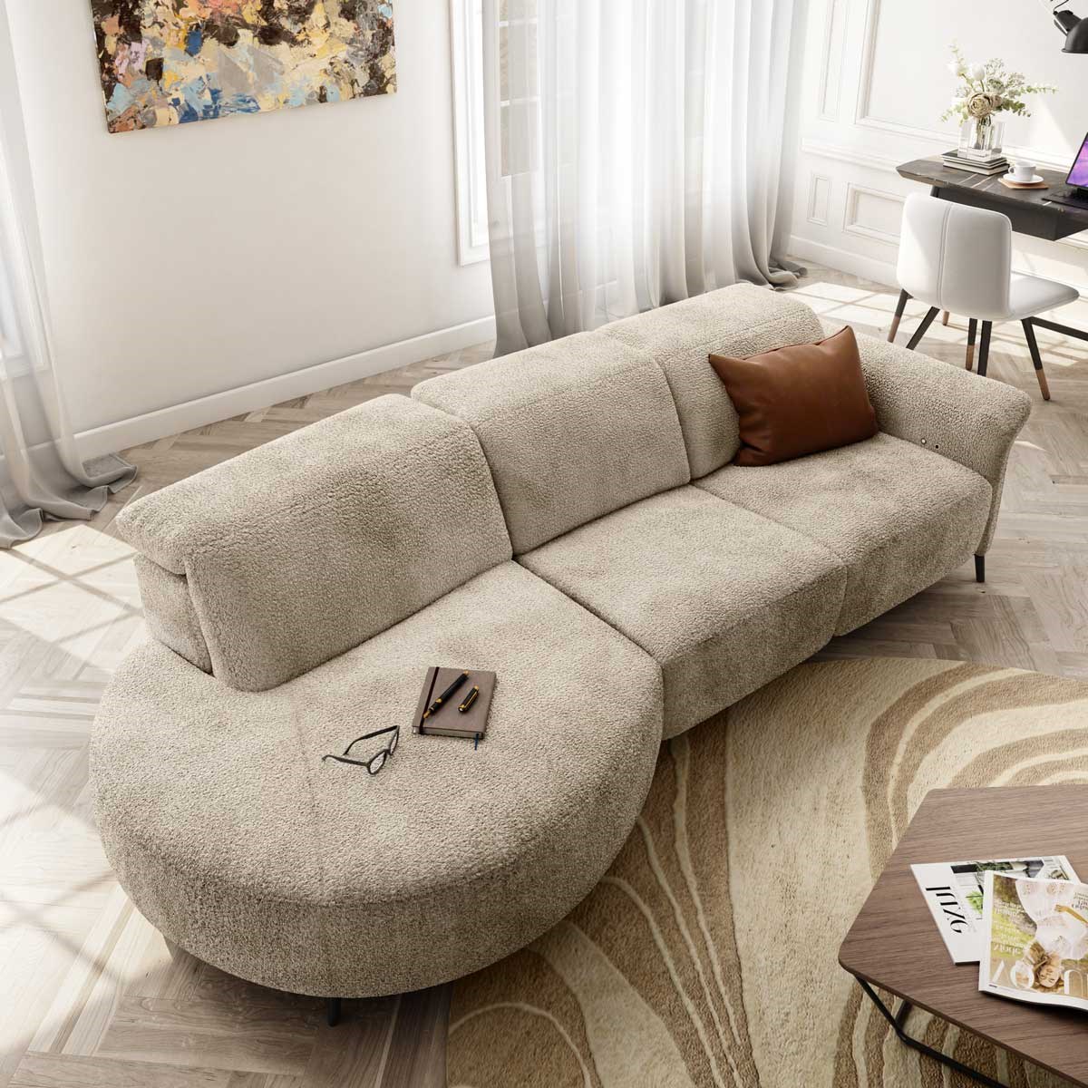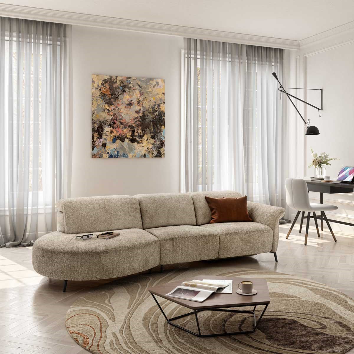 Ervaar luxe, comfort en modern design in één met de VENEZIA C300 zetel met open stuk links. Deze stijlvolle designbank in de zachte, neutrale stofkleur Sabbia brengt warmte en elegantie in elk interieur. De organische vormen en het royale open einde zorgen voor een luchtige, uitnodigende uitstraling die perfect past in een moderne leefruimte.