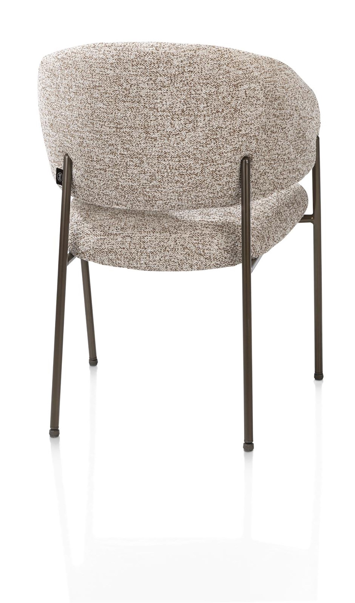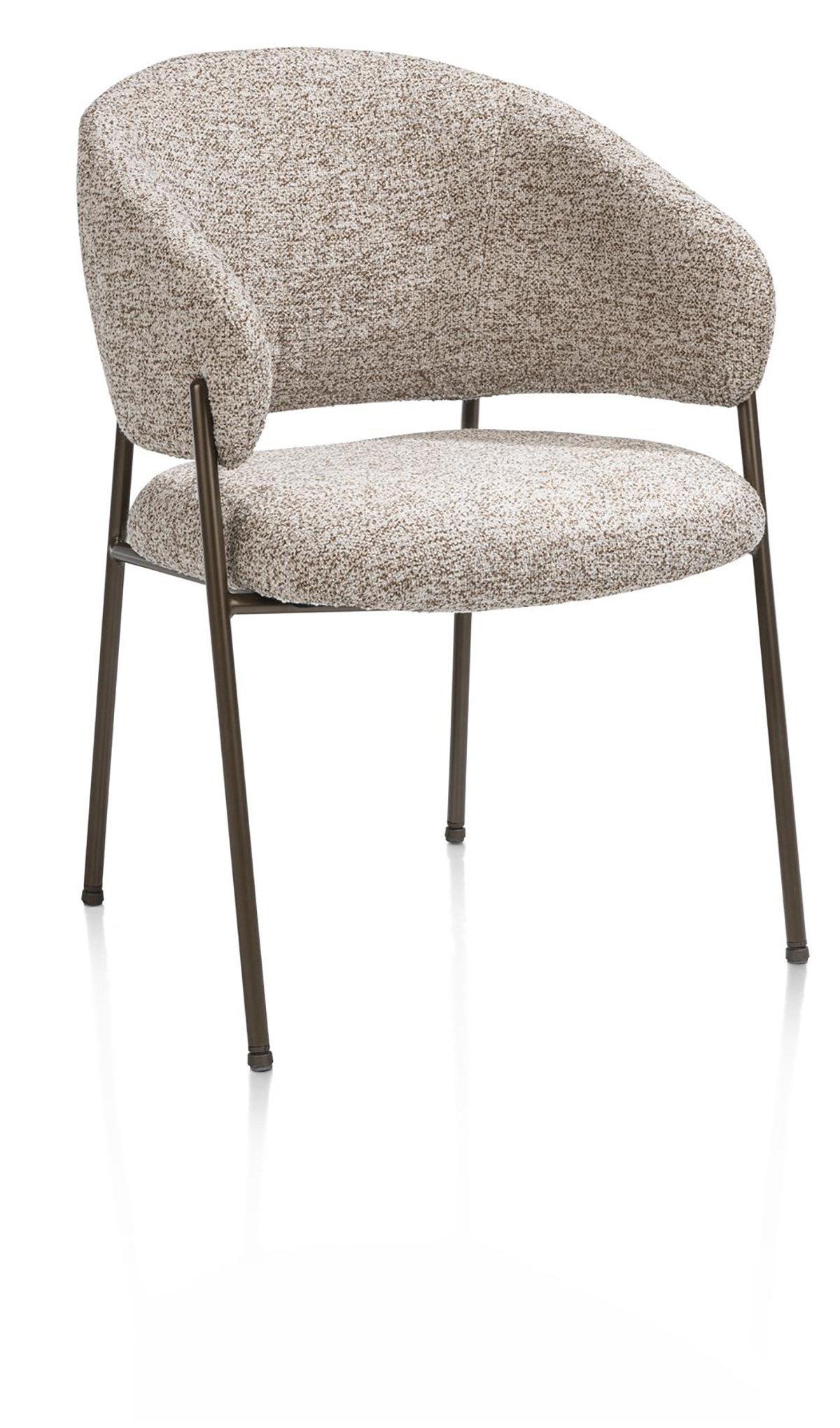 De stoel is bekleed met een warme, gestructureerde Luton stof in koperkleur en geeft uw interieur een vleugje karakter en verfijning. Het contrast met de vier slanke maar stevige bruine metalen poten geeft de stoel een uitgesproken eigentijdse uitstraling.