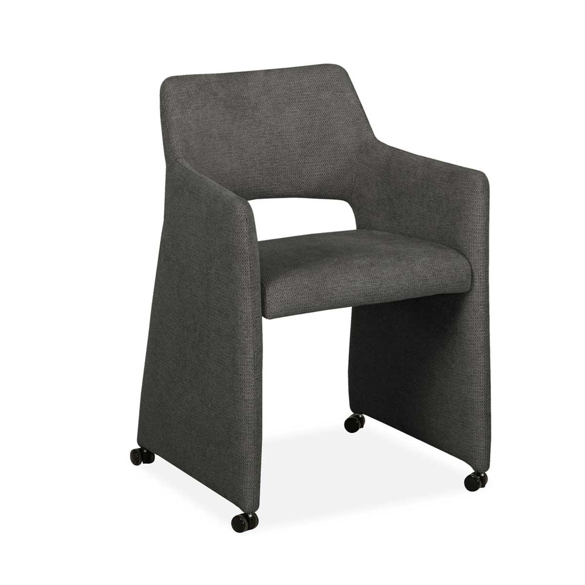 De armstoel JONES op wieltjes is de perfecte combinatie van comfort, mobiliteit en modern design. Dankzij de elegante antraciet stof straalt deze stoel warmte en zachtheid uit, waardoor hij moeiteloos past in zowel moderne als klassieke interieurs. De subtiele textuur van de stof geeft de stoel een luxe uitstraling, terwijl de neutrale kleur eenvoudig te combineren is met verschillende tafelstijlen en materialen.