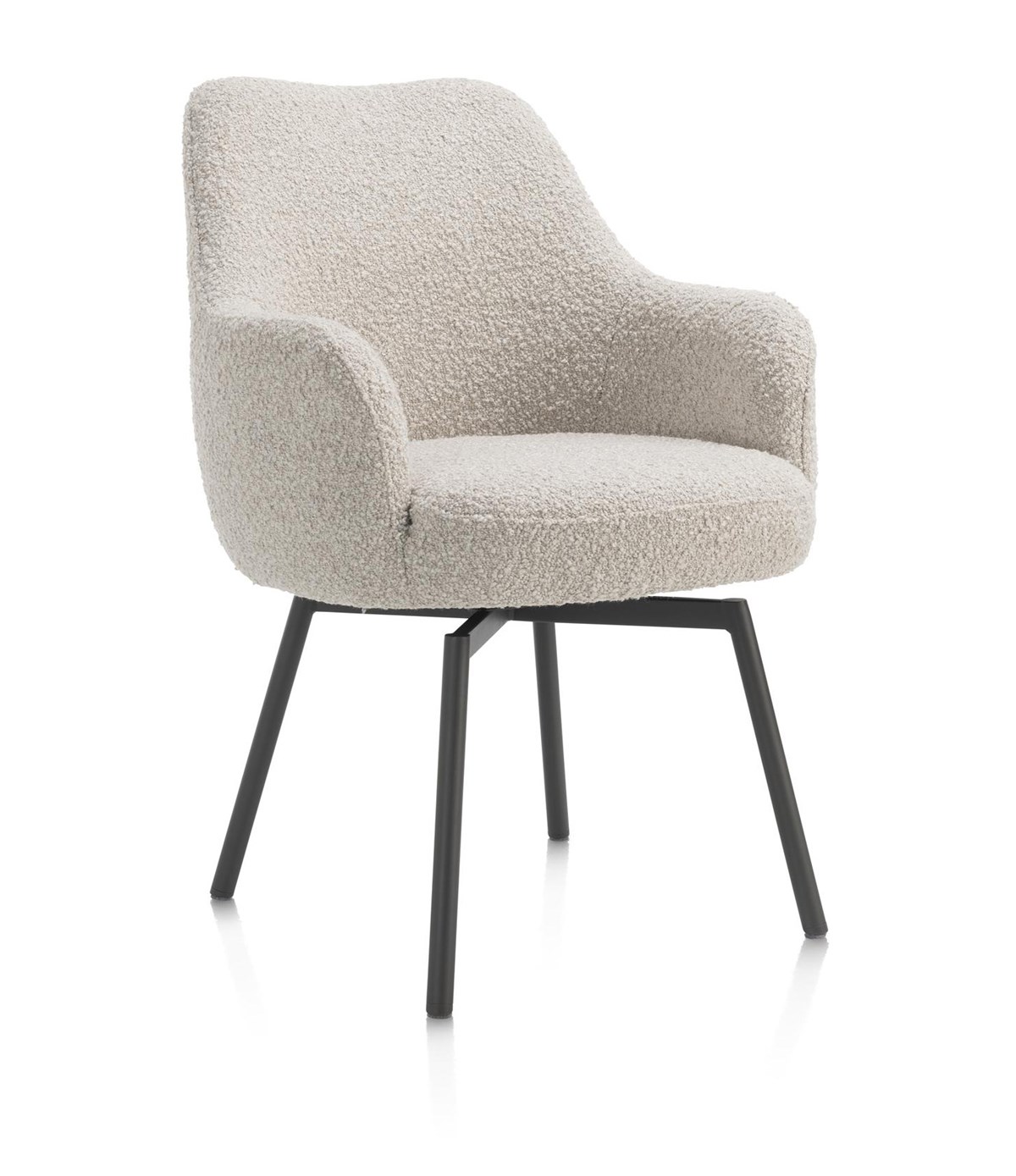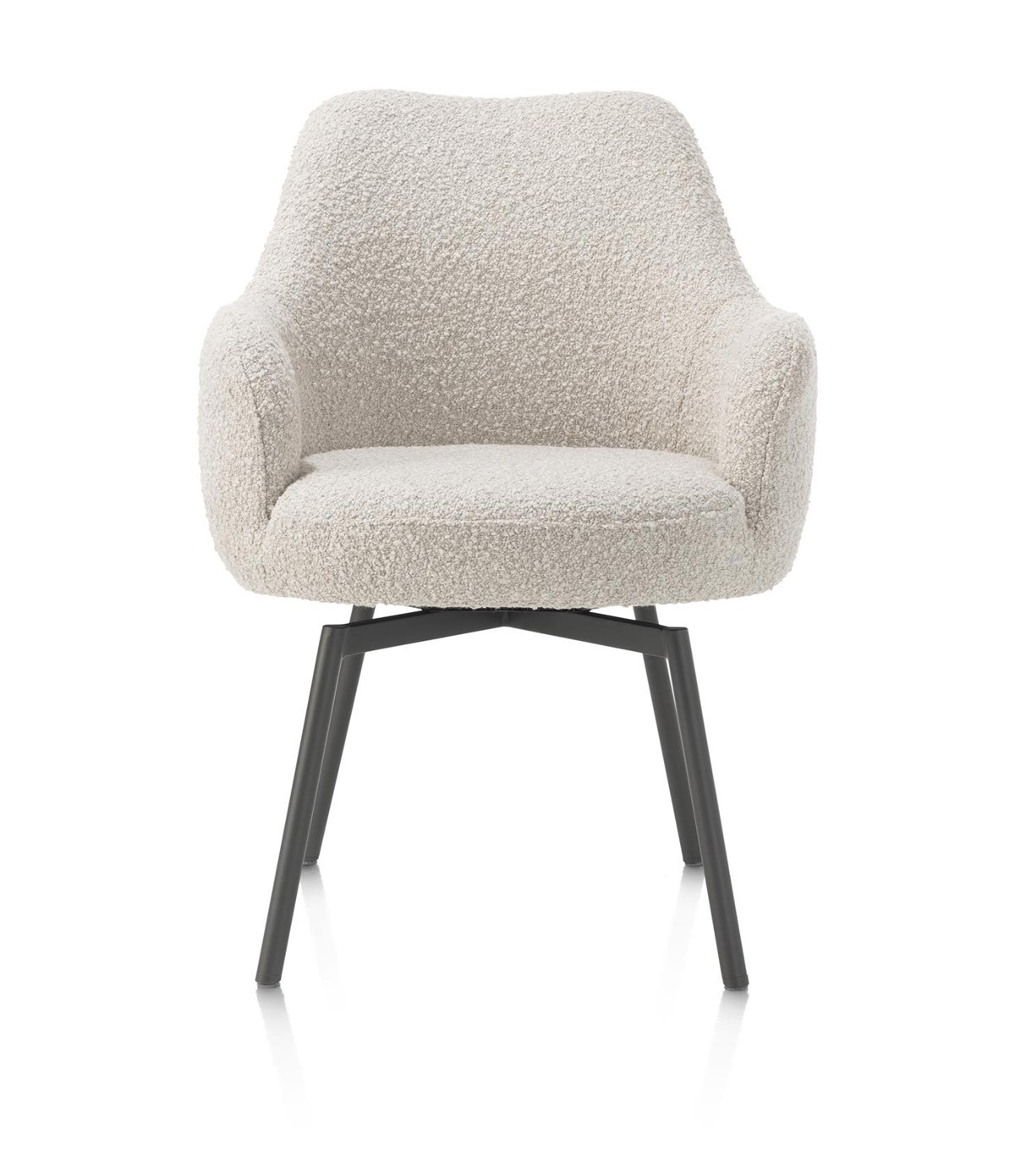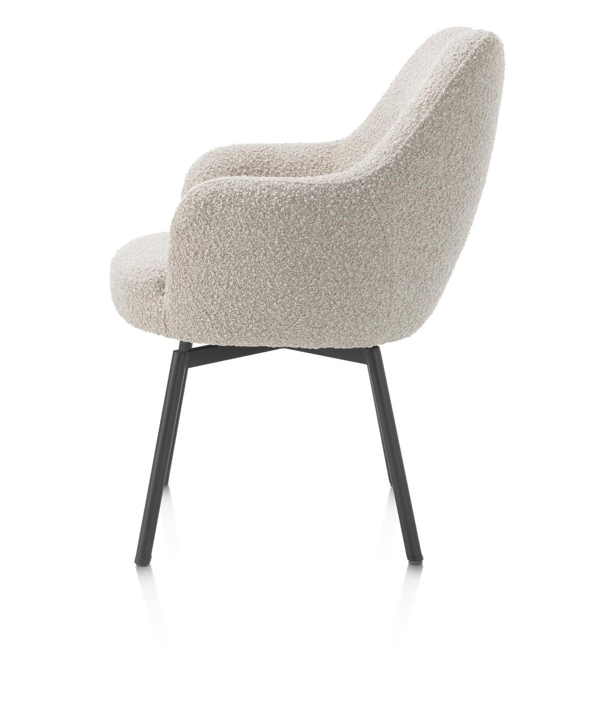 Deze armstoel met draaifunctie staat op een stevig onderstel met vier poten in de kleur grafiet. Voor wie liever een warmere uitstraling wil, is er ook een uitvoering met lichte eikenhouten poten. Bovendien is de Rocco-serie ook verkrijgbaar zonder armleuningen, zodat je eenvoudig een uniforme en stijlvolle eetkamer kunt samenstellen.