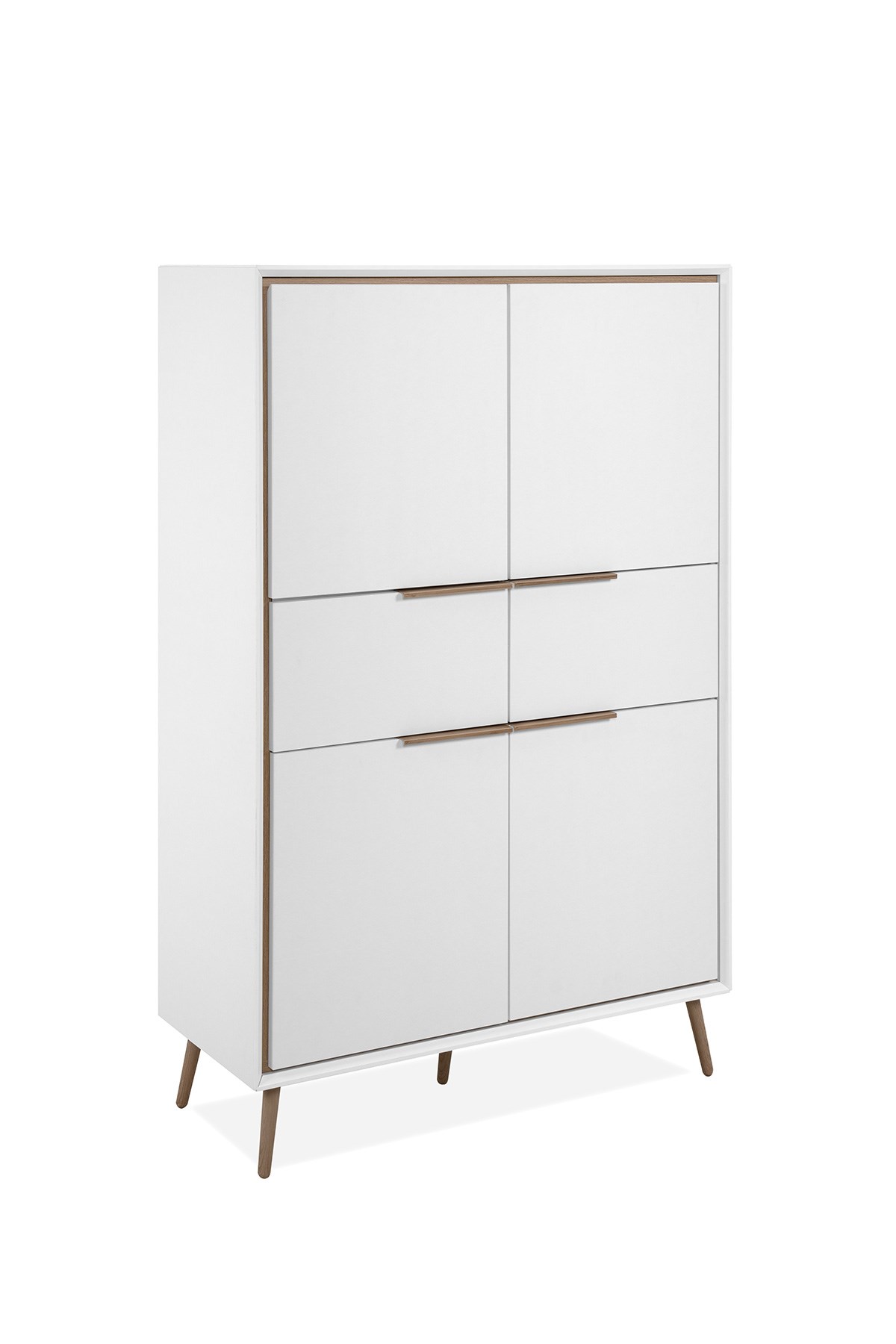De Arona hoge ladekast is een elegant meubelstuk dat praktisch en stijlvol combineert. Met 4 deuren en 2 lades biedt het voldoende opbergruimte terwijl het toch compact blijft. De witte kleur, met subtiele zwarte details, voegt een warme, moderne touch toe aan elke kamer. De eikenhouten poten zorgen voor een nette, eigentijdse afwerking, waardoor dit dressoir een perfecte keuze is om je interieur te verfraaien.