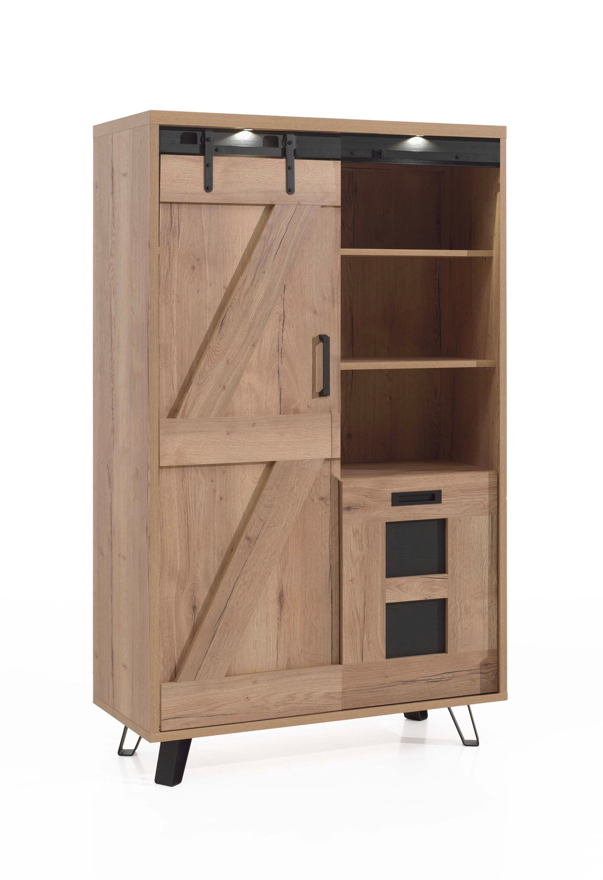 De bar CUEDO heeft een industriële stijl met karakter. De lichte eikenkleur geeft een warme sfeer aan jouw woonkamer. De details en de metalen poten zijn aanwezig om contrast aan te brengen in het meubel. De deur schuift op wieltjes. LED-verlichting is inbegrepen.