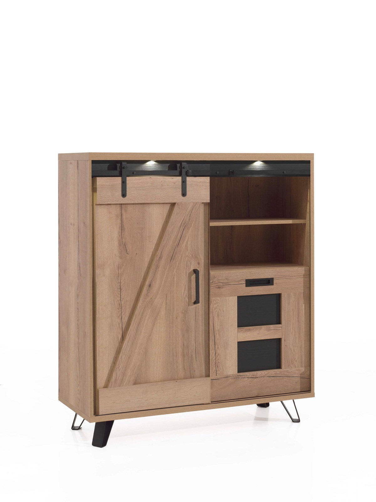 De bar CUEDO heeft een industriële stijl met karakter. De lichte eikenkleur geeft een warme sfeer aan jouw woonkamer. De details en de metalen poten zijn aanwezig om contrast aan te brengen in het meubel. De deur schuift op wieltjes. LED-verlichting is inbegrepen.