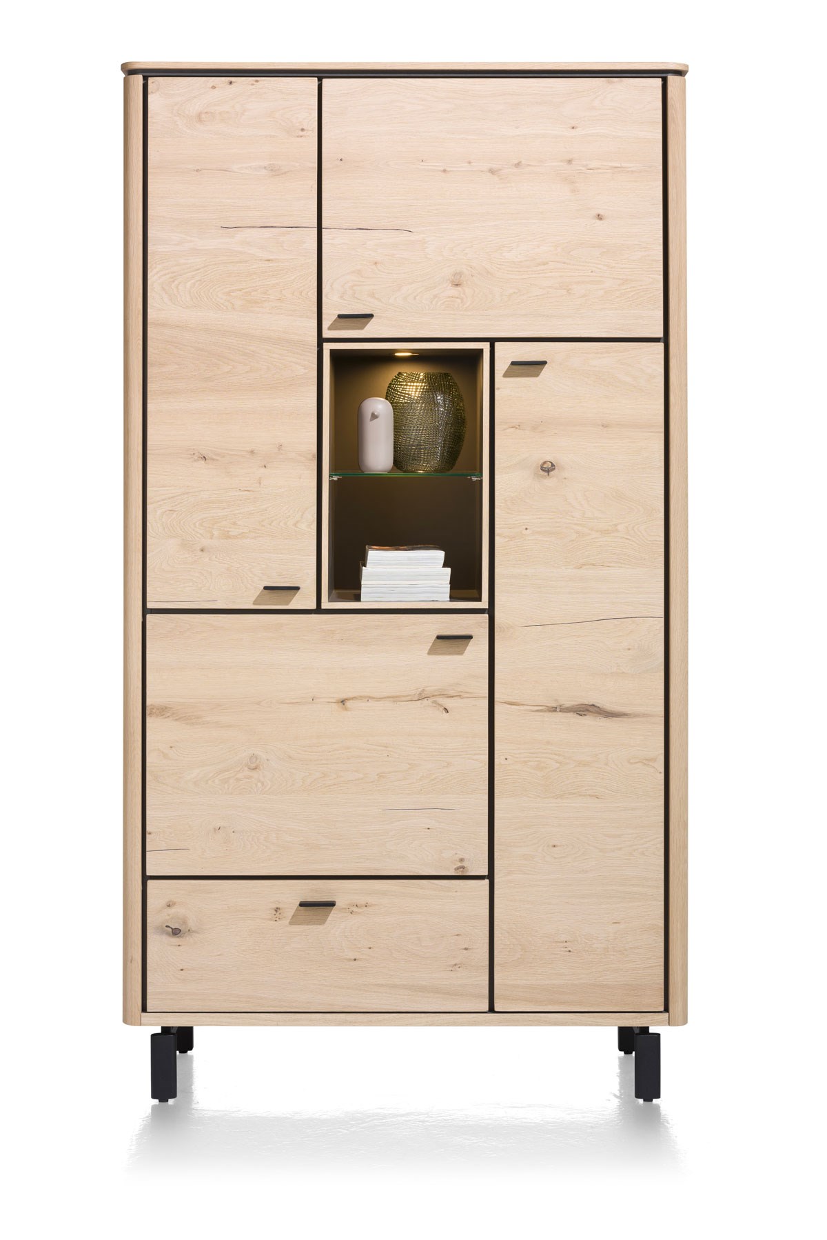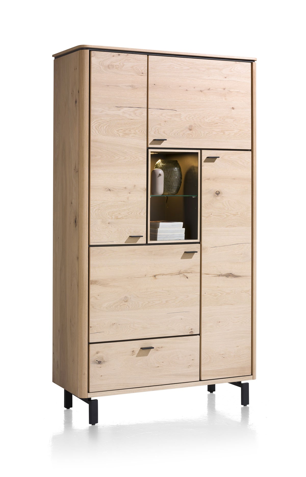 Met zijn hedendaags design vindt de LIVADA bar gemakkelijk zijn plaatsje in elk interieur. Deze bar is gerealiseerd in fineer eikenhout kleur natural gecombineerd met een zwart metalen structuur. Voorzien van 4 deuren, 1 lade en 2 open vakken biedt de bar LIVADA je voldoende opbergruimte. Bovendien zorgt de LED-verlichting in het open vak voor gezelligheid en sfeer.