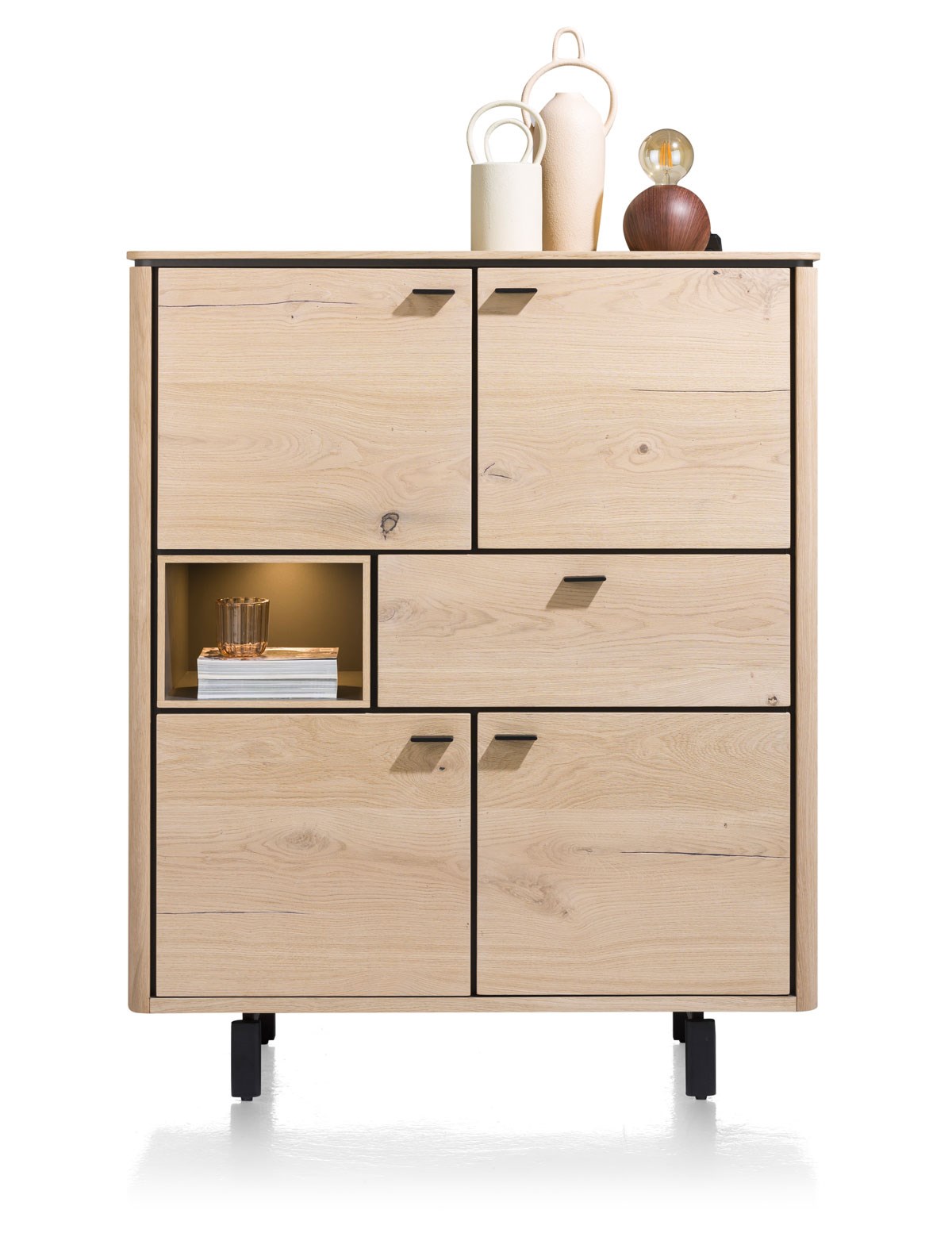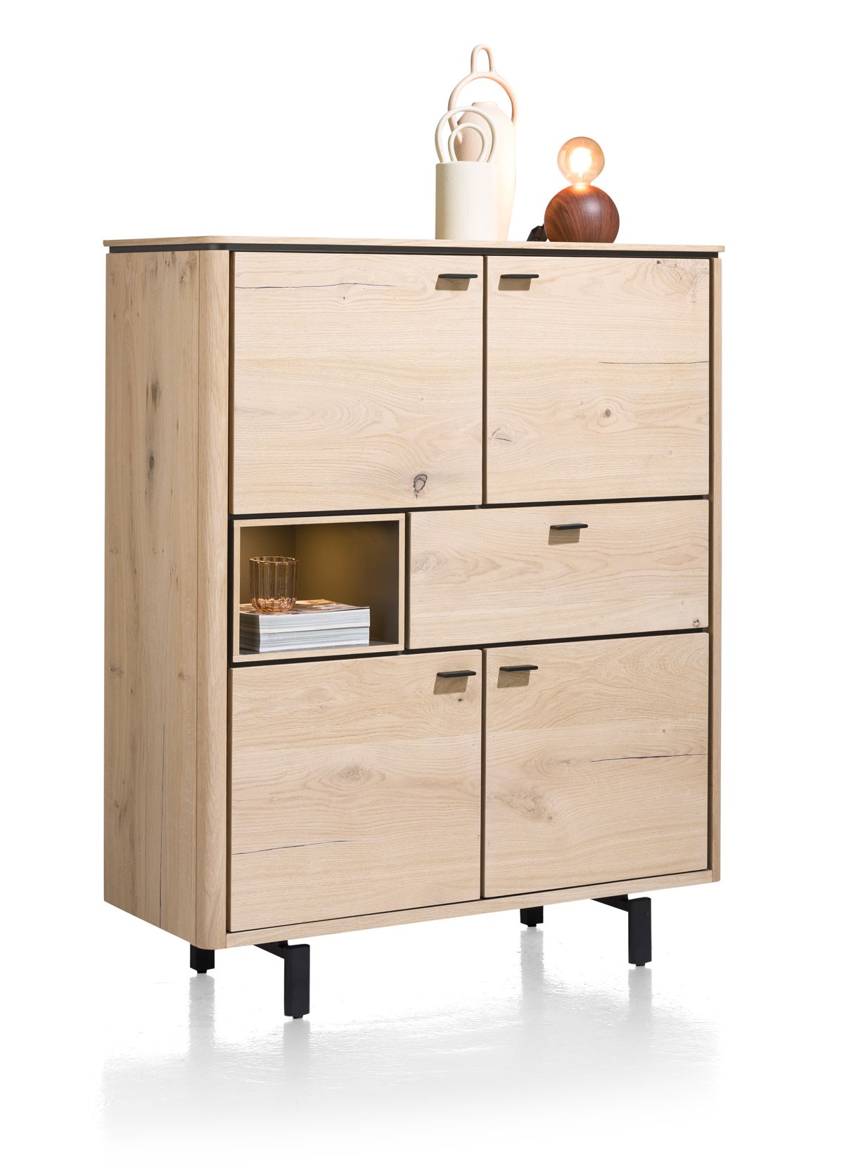 Met zijn hedendaags design vindt de LIVADA bar gemakkelijk zijn plaatsje in elk interieur. Deze bar is gerealiseerd in fineer eikenhout kleur natural gecombineerd met een zwart metalen structuur. Voorzien van 4 deuren, 1 lade en 1 open vak biedt de bar LIVADA je voldoende opbergruimte. Bovendien zorgt de LED-verlichting in het open vak voor gezelligheid en sfeer.