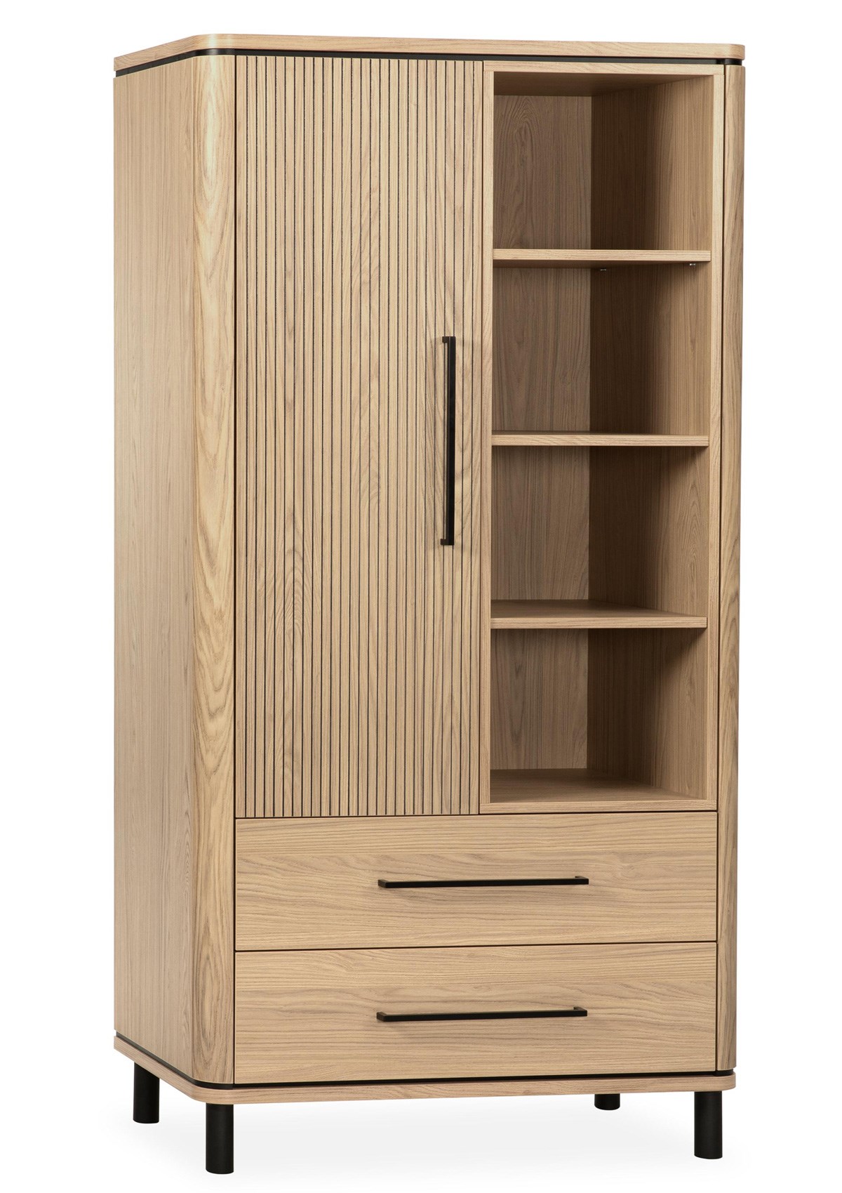 De bar MEDWAY combineert modern design met functionaliteit en is ideaal voor een praktische en gezellige inrichting. Met een breedte van 89 cm en een hoogte van 180 cm benut hij de ruimte in de hoogte en blijft hij toch compact. Het meubel is uitgerust met 1 deur, 2 laden en 4 open nissen, perfect voor het overzichtelijk opbergen en presenteren van flessen, glazen en accessoires. De afwerking in lamulux kleur Blond Oak zorgt voor een natuurlijke houtlook en is bovendien slijtvast, duurzaam en onderhoudsvriendelijk. Dankzij de strakke lijnen en de warme uitstraling past hij moeiteloos in zowel moderne als tijdloze interieurs. Een stevig en functioneel meubel voor dagelijks gebruik.