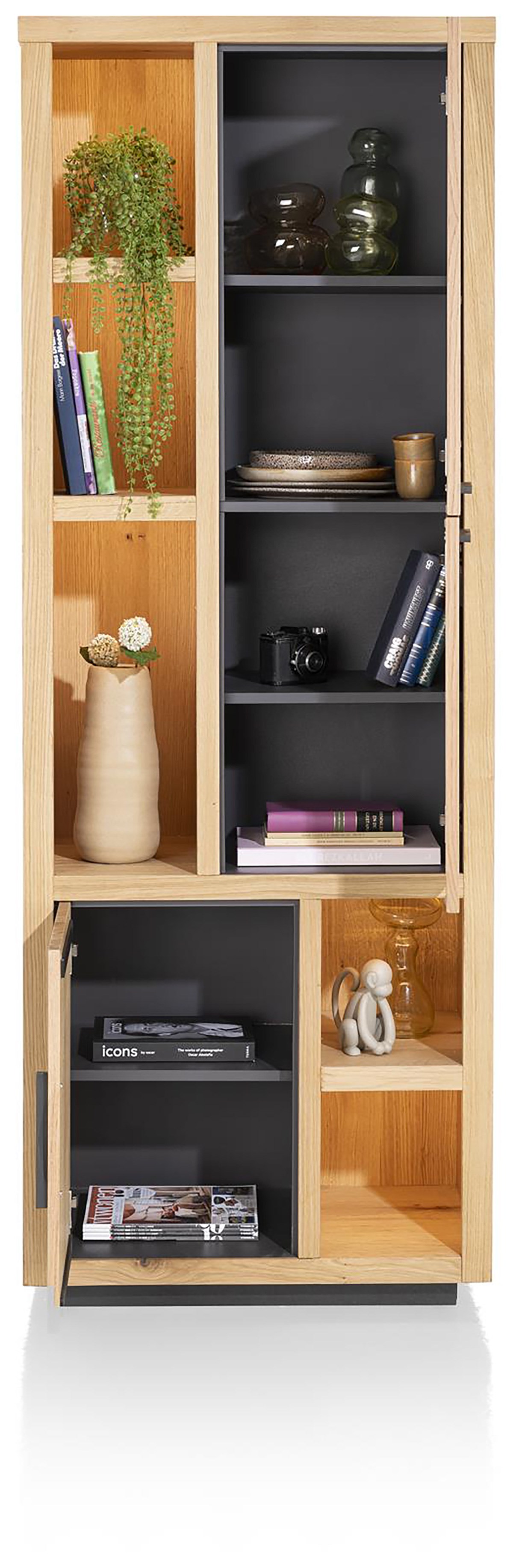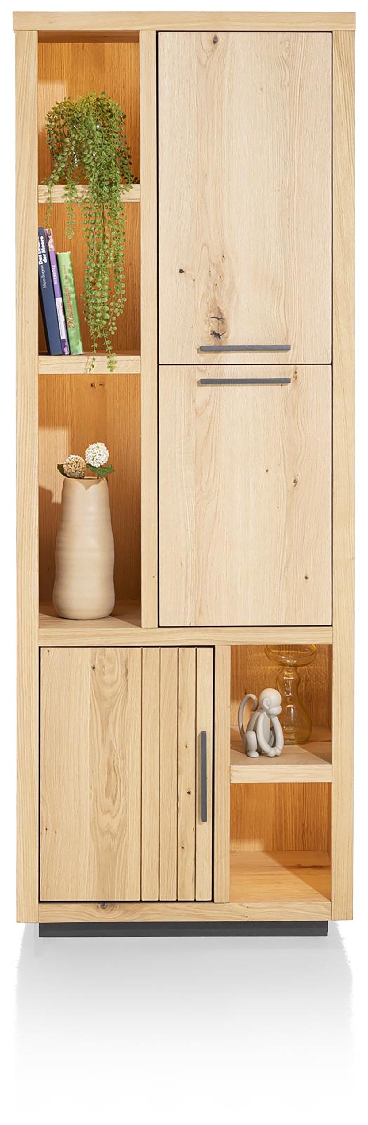 De lamellenstructuur, kenmerkend voor de collectie, geeft het meubel een subtiele retro-look met behoud van een strakke, eigentijdse stijl. Met een breedte van 75 cm en een hoogte van 215 cm benut hij de ruimte optimaal en biedt hij veel opbergruimte: 3 deuren en 5 nissen, ideaal voor flessen, glazen, accessoires of decoratieve voorwerpen.