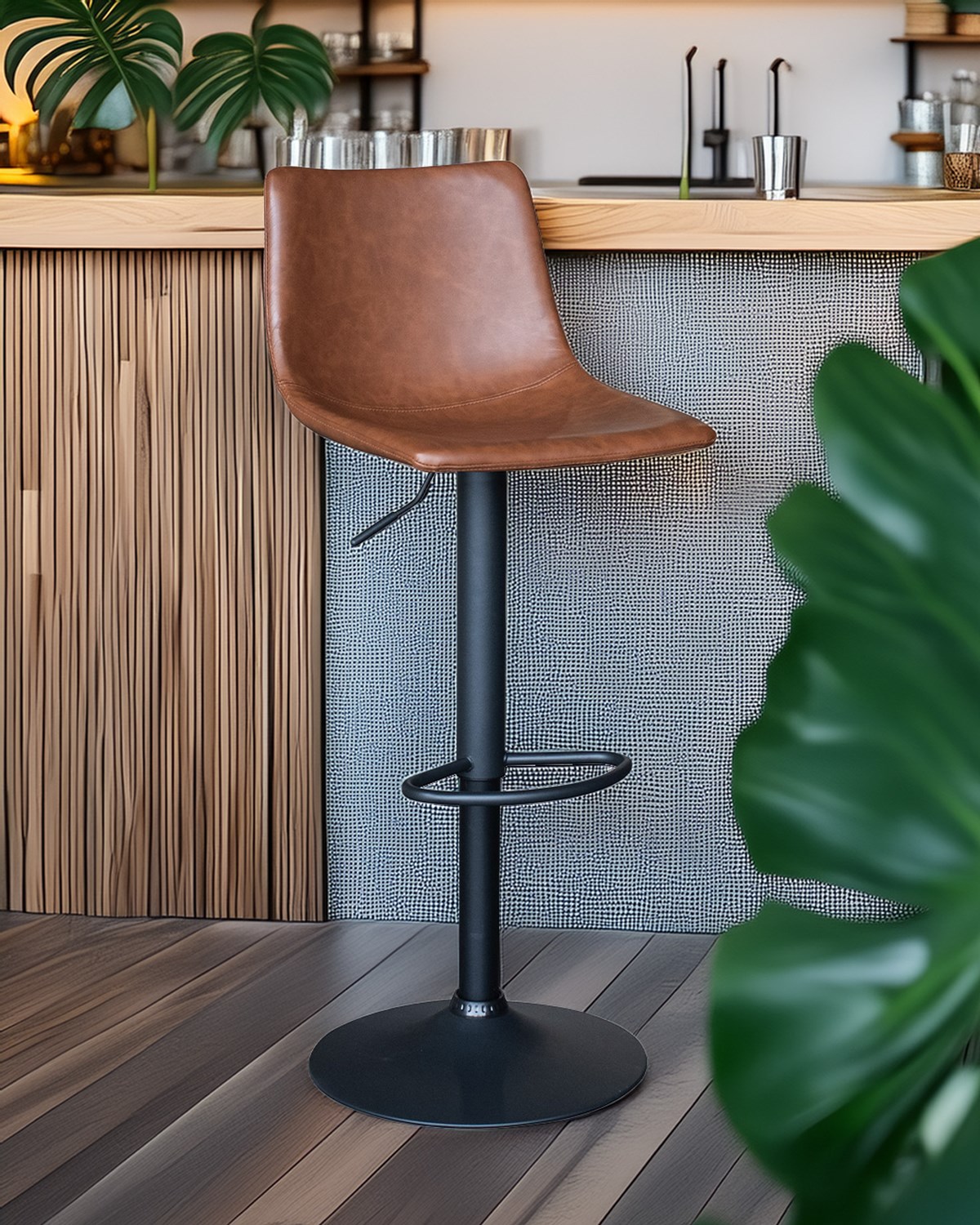 De CHARLIE barstoel in cognac kunstleder past in elk interieur. We houden van zijn heerlijk geraffineerde look en chique cognac kleur. Deze in hoogte verstelbare stoel zal er geweldig uitzien naast een kookeiland of een hoge tafel dankzij zijn uitnodigende en ergonomische ontwerp.