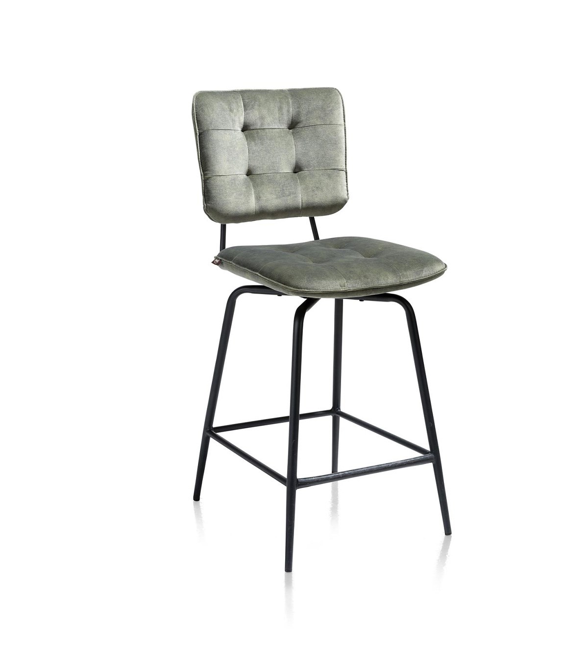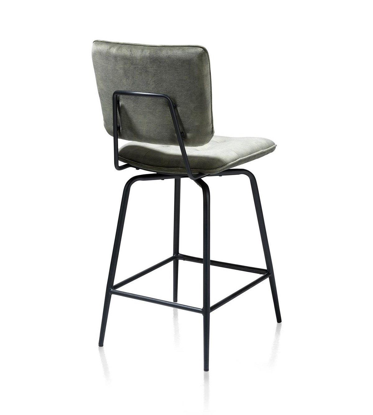 Het metalen frame in off black geeft de barstoel een moderne en stoere uitstraling, terwijl de gecapitonneerde rugleuning en draaibare zitting zorgen voor een luxe en uitnodigende look. De bekleding van de stoel is gemaakt van de hoogwaardige microvezelstof Karese in olijfgroen, die zacht en warm aanvoelt als velvet, maar tegelijkertijd bestand is tegen intensief gebruik.