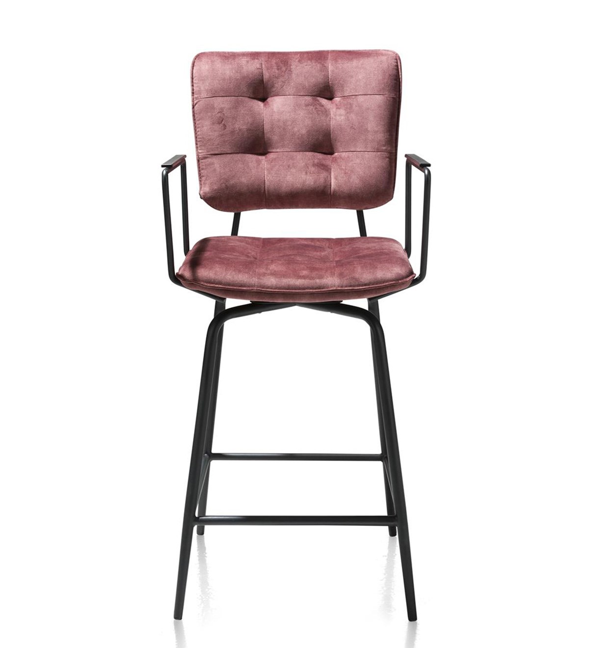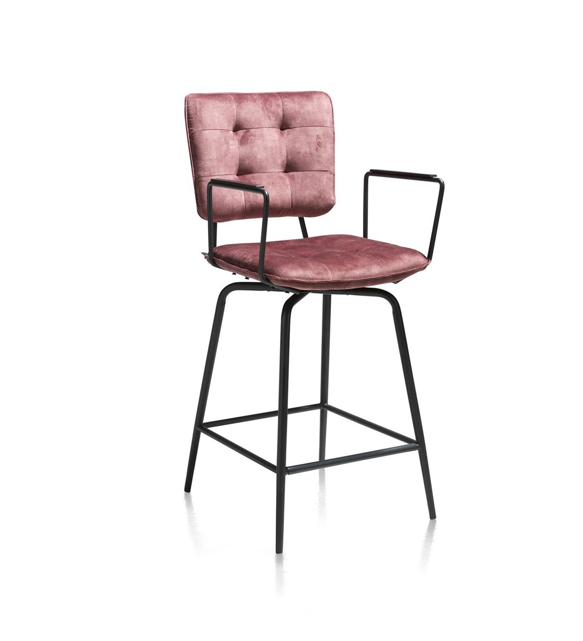 Het metalen frame in off black geeft de barstoel een moderne en stoere uitstraling, terwijl de gecapitonneerde rugleuning en zitting zorgen voor een luxe en uitnodigende look. De bekleding van de stoel is gemaakt van de hoogwaardige microvezelstof Karese in burgundy rood, die zacht en warm aanvoelt als velvet, maar tegelijkertijd bestand is tegen intensief gebruik.