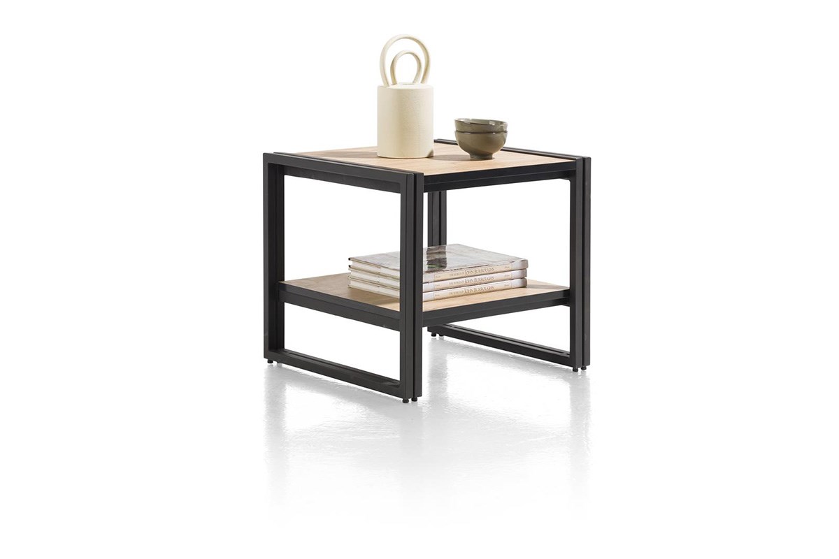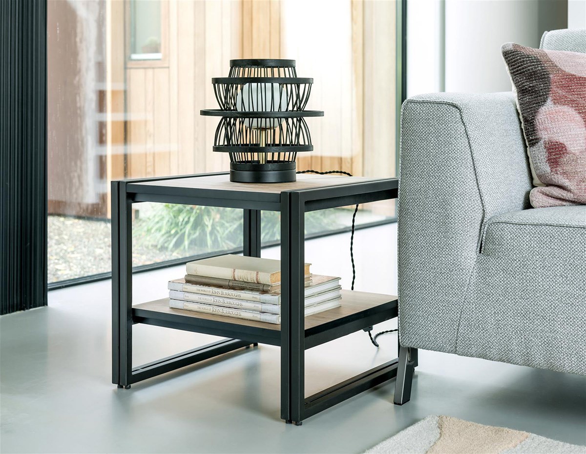 Met zijn vierkante ontwerp van 50 x 50 cm past hij gemakkelijk in elke ruimte. De natuurlijke houtlook met subtiele nuances geeft hem een vintage charme, terwijl het metalen onderstel een vleugje moderniteit en elegantie toevoegt.