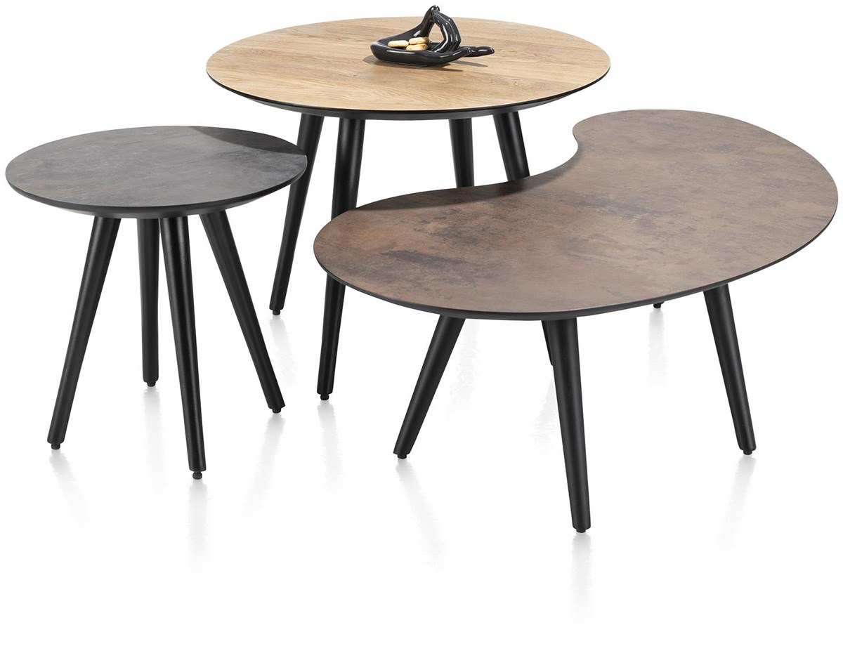 Breng een warme en eigentijdse toets in je woonkamer met de ronde MAZE salontafel. Het blad in Primo Laminato (HPL), hier in de kleur antraciet, valt op door zijn moderne uitstraling en gemakkelijke onderhoud. Met haar vier zwarte metalen poten, een hoogte van 32 cm en een diameter van 40 cm, combineert deze bijzettafel stevigheid, elegantie en een minimalistisch design. Perfect om alleen te gebruiken of te combineren met andere modellen uit de MAZE collectie, voor een harmonieuze en trendy look. Laat je inspireren door de nieuwste woontrend: meerdere kleine bijzettafels groeperen in plaats van één grote salontafel – voor een gezellige, flexibele en eigentijdse inrichting.